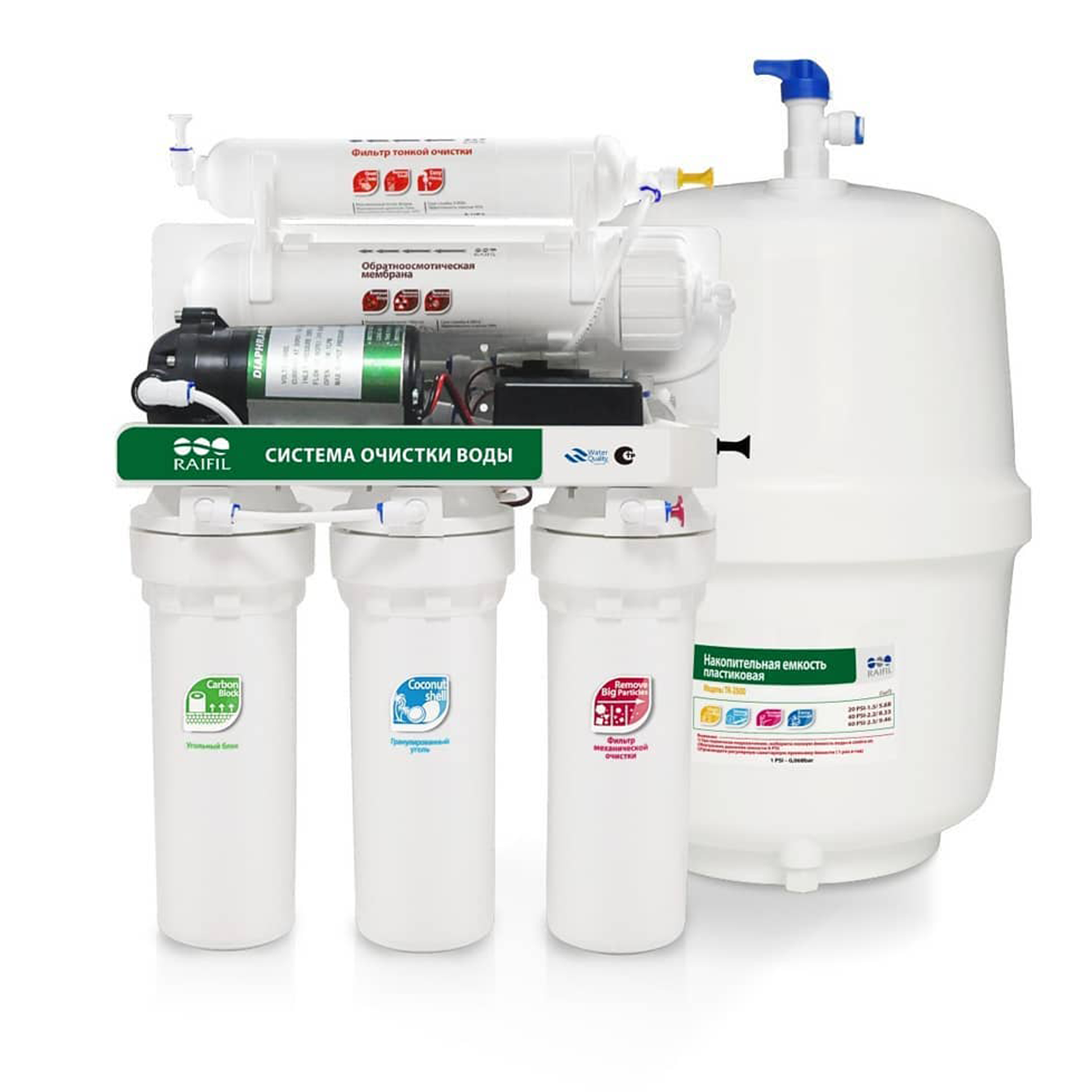 Водоочиститель Raifil RO 808-550BP-EZ 5-ти стадийная система очистка воды на основе обратного осмоса с насосом и баком 10 л.