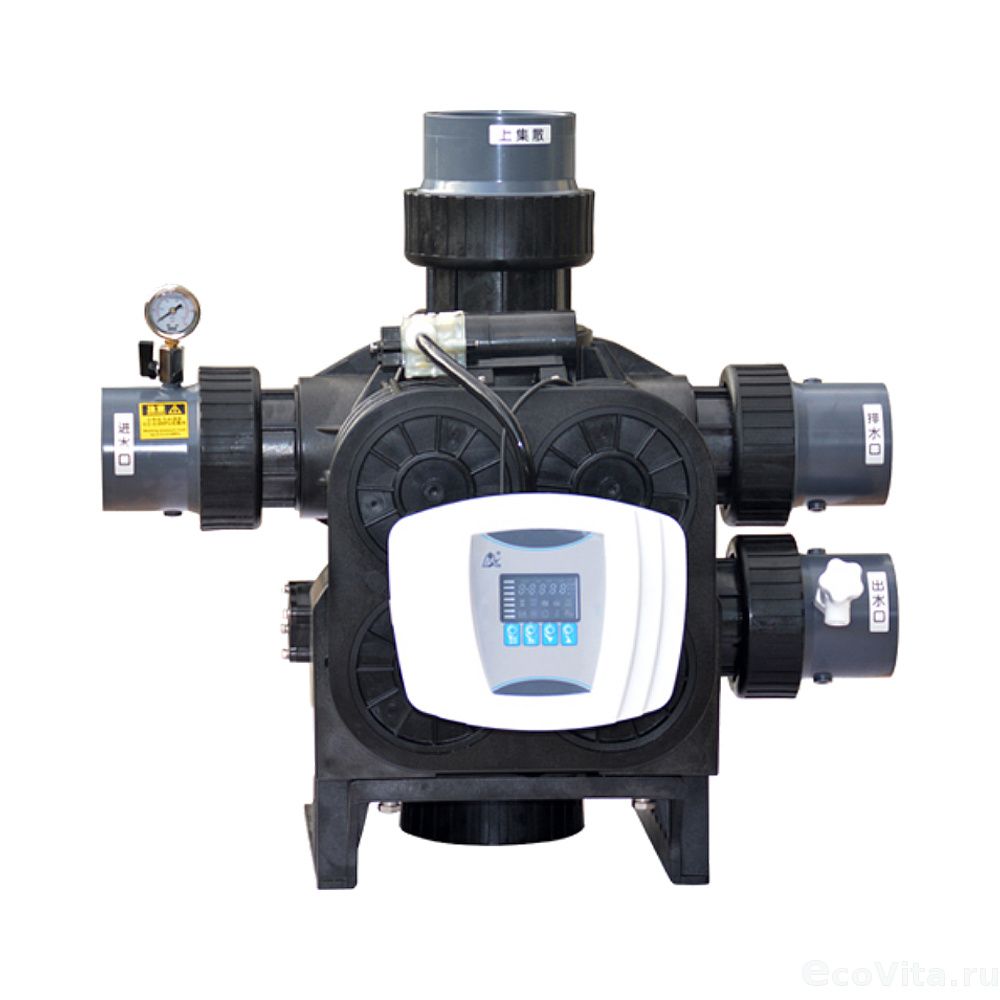 Он оснащен подсоединениями DN80. Он также крепится к баллонам фильтров размерами от 24 до 63 дюймов посредством порта DN100. Блок управления имеет боковую посадку, что очень удобно при работе с такими большими корпусами фильтров.