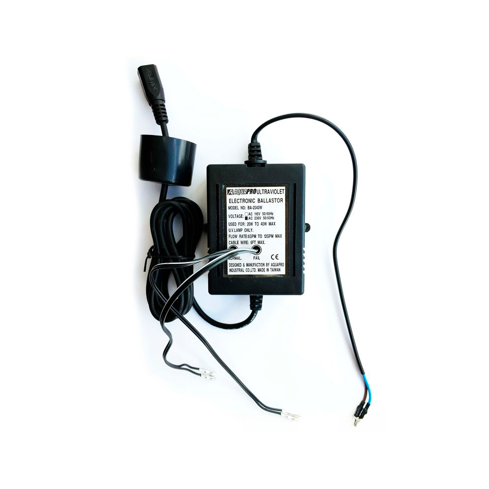 Блок питания предназначен для запуска УФ установки, поддержания требуемого режима электропитания и индикации ее работы. Блок питания имеет небольшие габариты и выполнен из прочного пластика с вводами для электрокабелей. Подходит для установок AquaPro UV36-UV72.