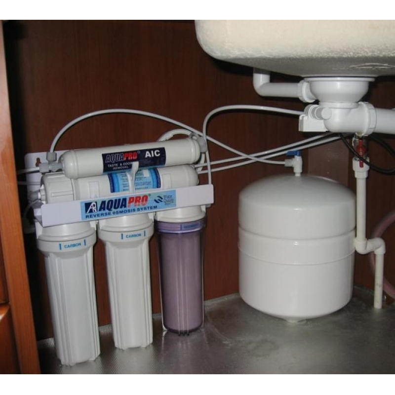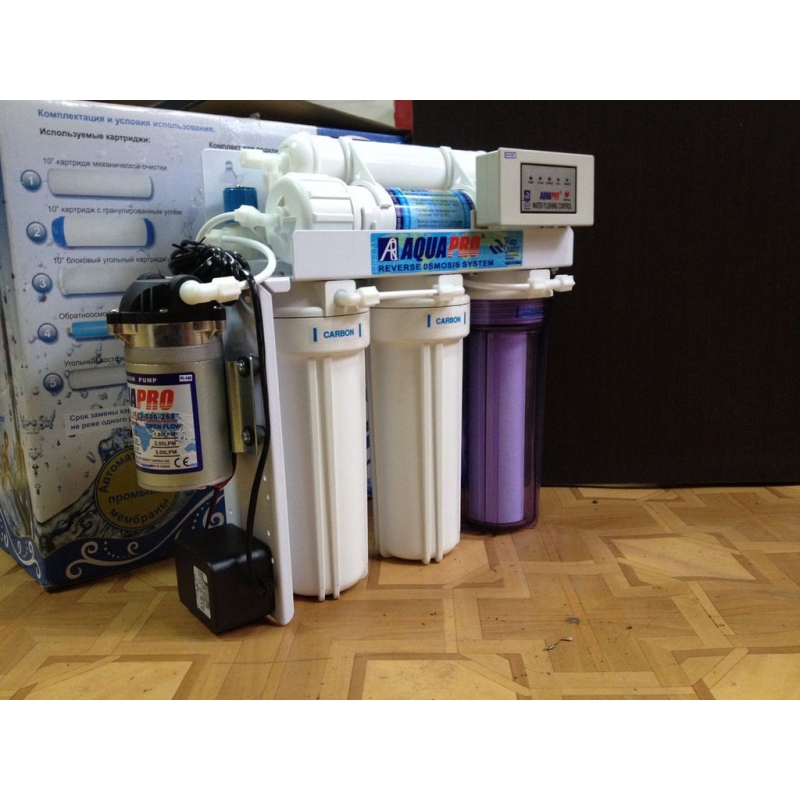 5-ступенчатая установка обратного осмоса AQUAPRO AP-800 с насосом и блоком обратной промывки мембраны. Система очистки воды удаляет до 99% примесей, содержащихся в воде. Фильтр AquaPro, устанавливается под кухонной мойкой или ином месте, с выводом крана питьевой воды на столешницу или на мойку. Благодаря встроенному блоку обратной промывки MС-2 значительно увеличивается срок эксплуатации мембранного элемента. Обратная промывка осуществляется как в автоматическом(3 раза/сутки), так и в ручном режиме.