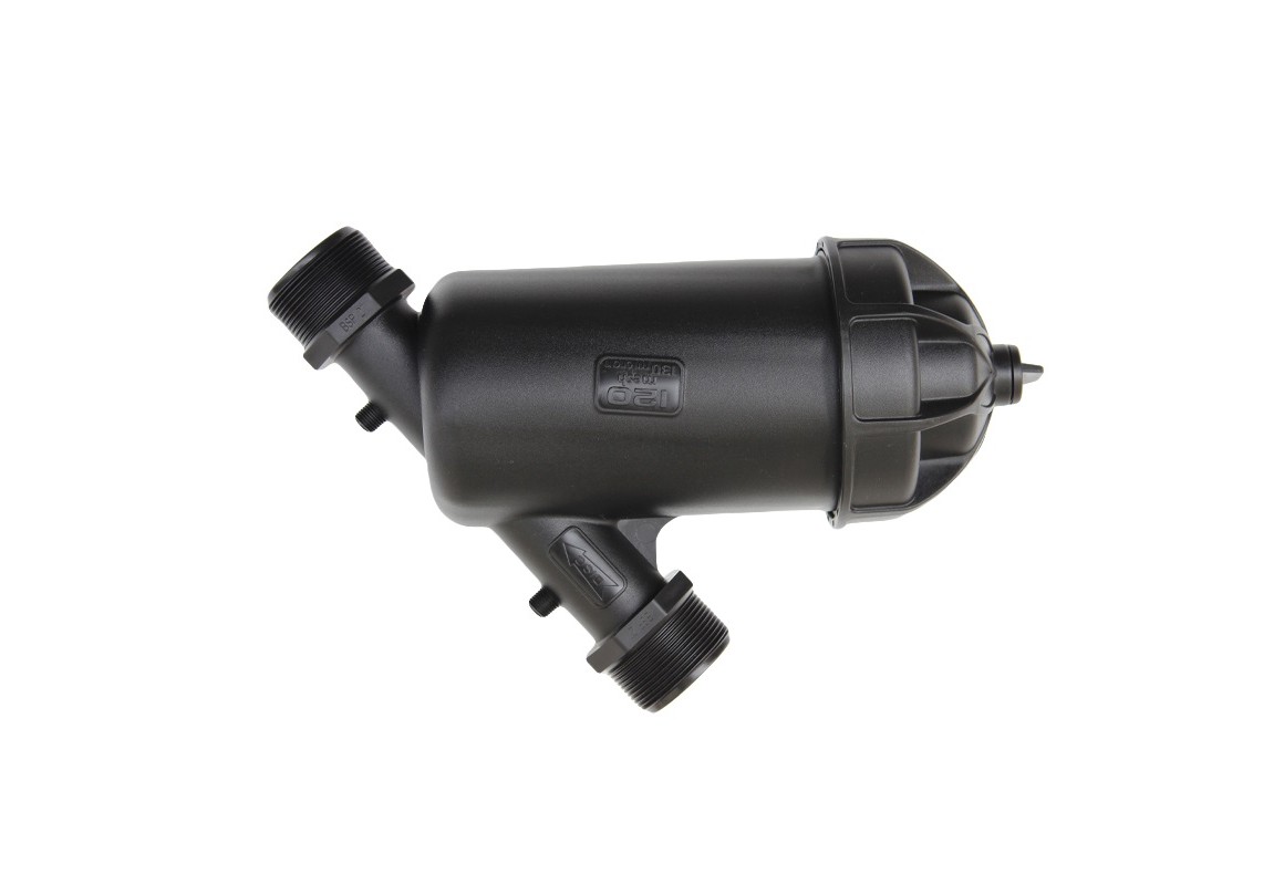 Фильтр дисковый F90YD состоит из пластикового корпуса формы Y. Корпус имеет съемную крышку с резьбой, которая отсоединяется от фильтра для замены дискового картриджа. Данный фильтр крепится к стене. Для его подключения к магистрали холодной воды используются два порта с наружной резьбой 3″, расположенных на одной оси. Также имеется возможность подключения к корпусу двух манометров на вход и на выход воды. При помощи манометров осуществляется наблюдение за состоянием дискового картриджа.