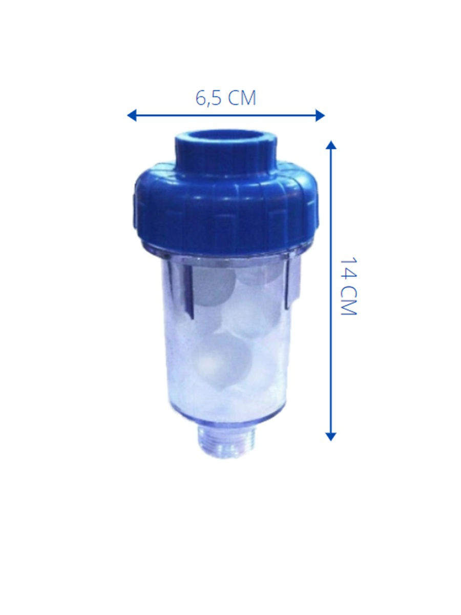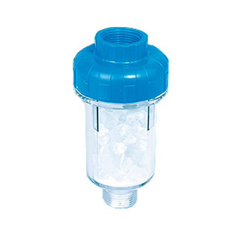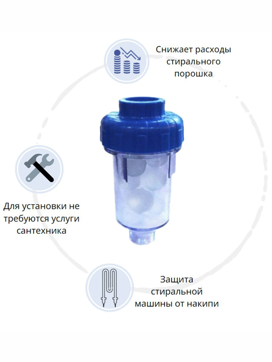 Полифосфатный фильтр применяется в бытовых стиральных машинах и служит для защиты нагревательных элементов и внутренних поверхностей от образования карбонатных соединений(накипи). Внутри прозрачной колбы засыпаны кристаллы полифосфата натрия. При прохождении через кристаллы, вода постепенно растворяется их, насыщаясь полифосфатом. Полифосфатная пленка обволакивает ионы кальция и магния и препятствует образованию накипи. Полифосфат полностью не растворится, однако со временем его умягчающая способность снижается.