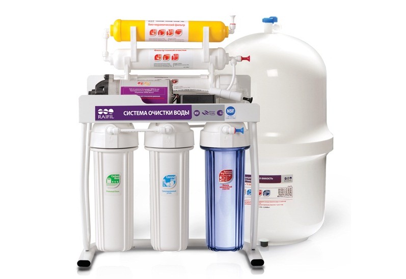 Cистема обратного осмоса Raifil QM-90 представляет собой самый совершенный фильтр на сегодня. Работает обратноосмотическая система Raifil QM-90 по принципу проникновения молекул сквозь тонкопленочную полупроницаемую мембрану с порами 0,0001 микрон под давлением. В процессе обратного осмоса происходит отделение молекул воды от всех примесей и загрязнений, после чего на выходе получается полностью чистая вода. Система обратного осмоса Raifil QM-90 устанавливается под мойку либо на стену благодаря удобному кронштейну, а вода подается через кран на столешнице.