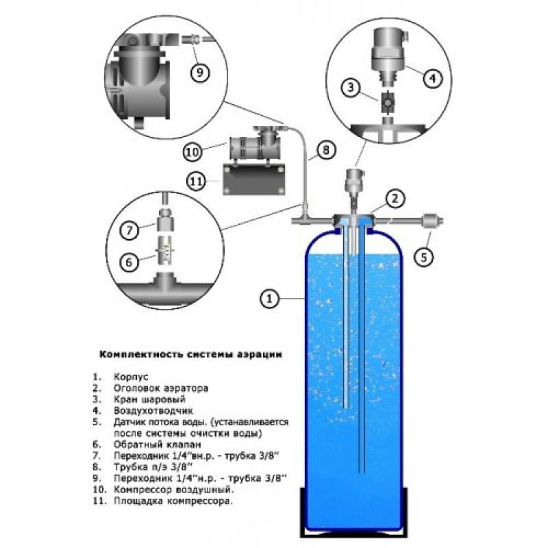 Во время прохождения воды через станцию водоподготовки, датчик потока срабатывает, и подавая питание, включает воздушный компрессор. Компрессор по трубке, через обратный клапан, начинает нагнетать под давлением (до 6 атм.) в трубу с водой — кислород. Таким образом, очищаемая вода смешивается с пузырьками воздуха и через вход в распределительный оголовок попадает в корпус аэрационной колонны. Внутри корпуса аэрационной колонны происходит процесс взаимодействия воды с кислородом. Примеси (сероводород, углекислый газ и т.д.) через воздушный коллектор оголовка аэратора поступают на воздуха-отделительный клапан и удаляются в дренажную систему. Окисленное железо и марганец, через выход оголовка аэрации, поступают на следующую ступень станции водоподготовки (зачастую на установку обезжелезивания воды) для завершающего до окисления и полного удаления. Когда расход воды отсутствует, воздушный компрессор тоже не работает и воздух не нагнетается в корпус системы аэрации воды.