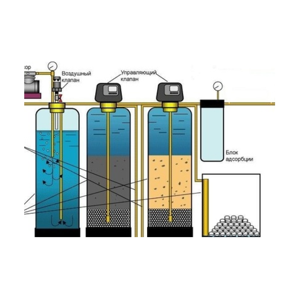 В подавляющем большинстве артезианских и песочных скважин присутствует железо в двухвалентоном виде (прозрачная вода). Поэтому для очистки воды из скважины от двухвалентного железа его нужно сначала окислить до трехвалентного состояния, т.е. до состояния желтой, рыжей или коричневой воды. Для этого используется аэрационная колонна (аэратор) с компрессором для насыщения воды кислородом воздуха и отдувки неприятного запаха. При таком активном насыщении воды кислородом воздуха происходит ускорение окисления марганца, сероводорода, железа, а для окончательного удаления железа, мутности, цветности используется фильтр обезжелезиватель.