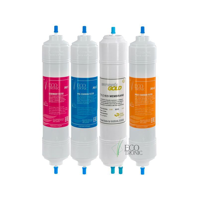Комплект сменных фильтров (картриджей) для пурифайеров с обратно-осмотической мембраной (RO). Подобные пурифайеры маркируются после дефиса xx-R4L или xx-R4T, где xx — серия и номер модели, R — мембрана обратного осмоса, 4- ступеней очистки, L или Т — напольный или настольный. Рекомендуемая замена фильтров: не реже 1 раза в 6 месяцев. Ресурс каждого картриджа до 3000л. Мембрану обратного осмоса можно менять 1 раз в год, ресурс от 3000 до 6000л., в зависимости от минерализации воды. При большом потреблении (в больших офисах, фитнесах и т.п.) фильтры могут меняться чаще — 1 раз в 3 или 2 месяца. Обратитесь к нам, мы рассчитаем и дадим наши рекомендации по замене. Через раз рекомендуем также менять все угловые коннекторы