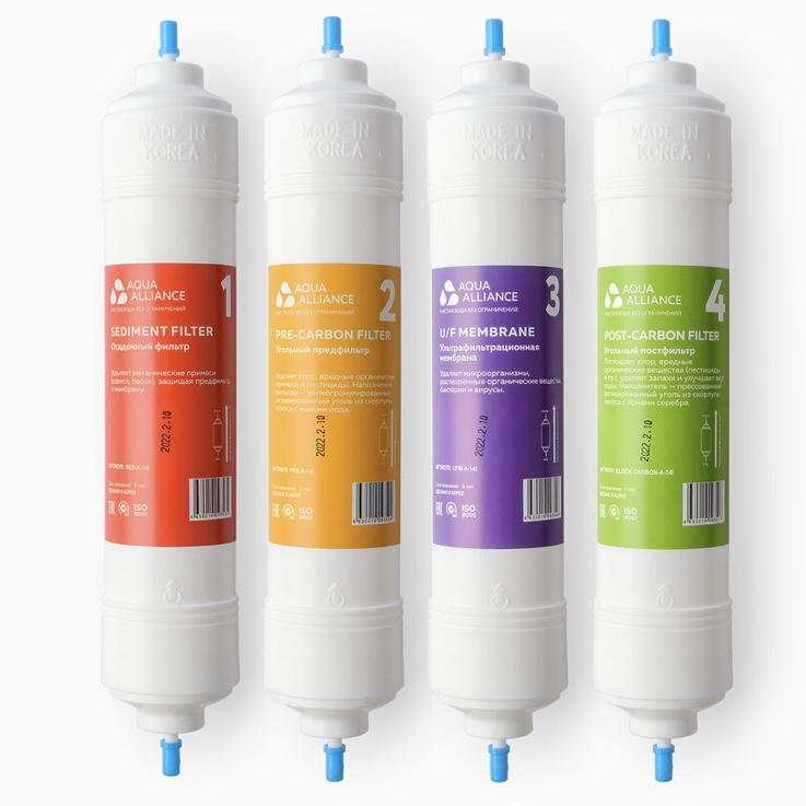 Комплект сменных фильтров (картриджей) для пурифайеров с ультра-фильтрационной мембраной (UF) Универсальный размер фильтров позволяет устанавливать его не только в любые типы стандартных напольных пурифайеров, но и во многие фильтровальные системы (например, в фильтр-систему под мойку). Мы рекомендуем производить замену фильтров: не реже 1 раза в 6 месяцев. Комплектация: Фильтр Aquaalliance SID-C-14I, Фильтр Aquaalliance PRE-C-14I, Фильтр Aquaalliance UFM-C-14I, Фильтр Aquaalliance POS-C-14I. Тип фильтров — I. Вид фильтра — 14 дюймов. Страна производства — Корея.