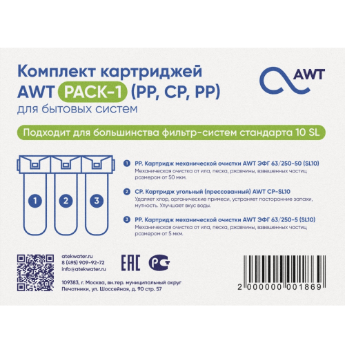 Комплект картриджей AWT PACK-1 для фильтров обратного осмоса – это три картриджа предназначенные для предварительной подготовки воды перед мембраной в бытовых фильтрах обратного осмоса. Использование картриджей комплекта позволяет снизить содержание в водопроводной воде примесей, которые сокращают срок службы мембраны, таких как хлор, хлорорганические соединения и механические примеси. После предварительной трехступенчатой очистки вода направляется на мембрану. Таким образом, картриджи предварительной фильтрации не только частично очищают воду, но и предохраняют мембрану от дополнительных нагрузок и повреждений. Подходит к фильтрам других производителей со стандартным типоразмером 2,5”х10” (10SL). Технические и эксплуатационные характеристики: 1-я ступень — картридж из вспененного полипропилена, 50 мкм 2-я ступень — картридж AWT CP с прессованным активированным углем из скорлупы кокосовых орехов 3-я ступень — картридж из вспененного полипропилена, 5 мкм Рабочее давление, атм- 3–4 Рабочая температура воды, °С — +4…+30 Рекомендуемая скорость фильтрации не более, л/мин — 4 Максимальный ресурс, л — 8000 Срок эксплуатации, не более 6 мес.