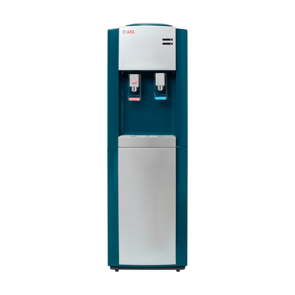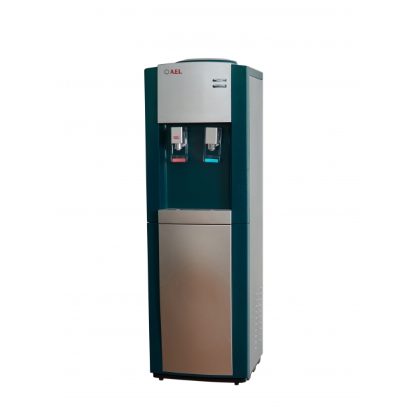 Напольный кулер с компрессорным охлаждением цвета маренго с сереберистой вставкой на лицевой панели и лотком. Верхняя загрузка бутыли. Удобные краники «нажим чашкой» с внутренней резьбой, что позволяет при необходимости легко и быстро их менять. Кран горячей воды с кнопкой-защитой от случайного нажатия.