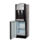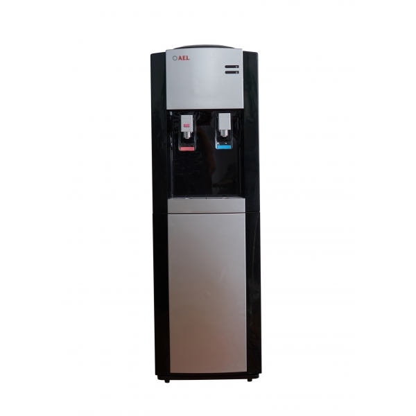 Напольный кулер с компрессорным охлаждением черного цвета с сереберистой вставкой на лицевой панели и лотком с холодильником. Верхняя загрузка бутыли. Удобные краники «нажим чашкой» с внутренней резьбой, что позволяет при необходимости легко и быстро их менять. Кран горячей воды с кнопкой-защитой от случайного нажатия.