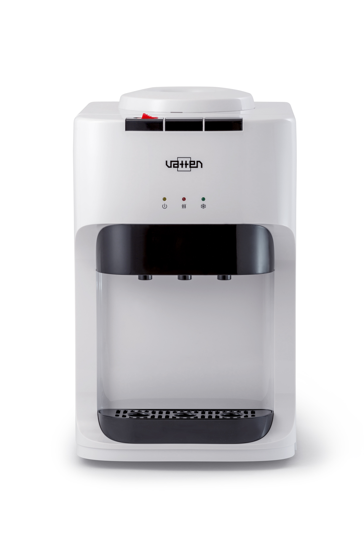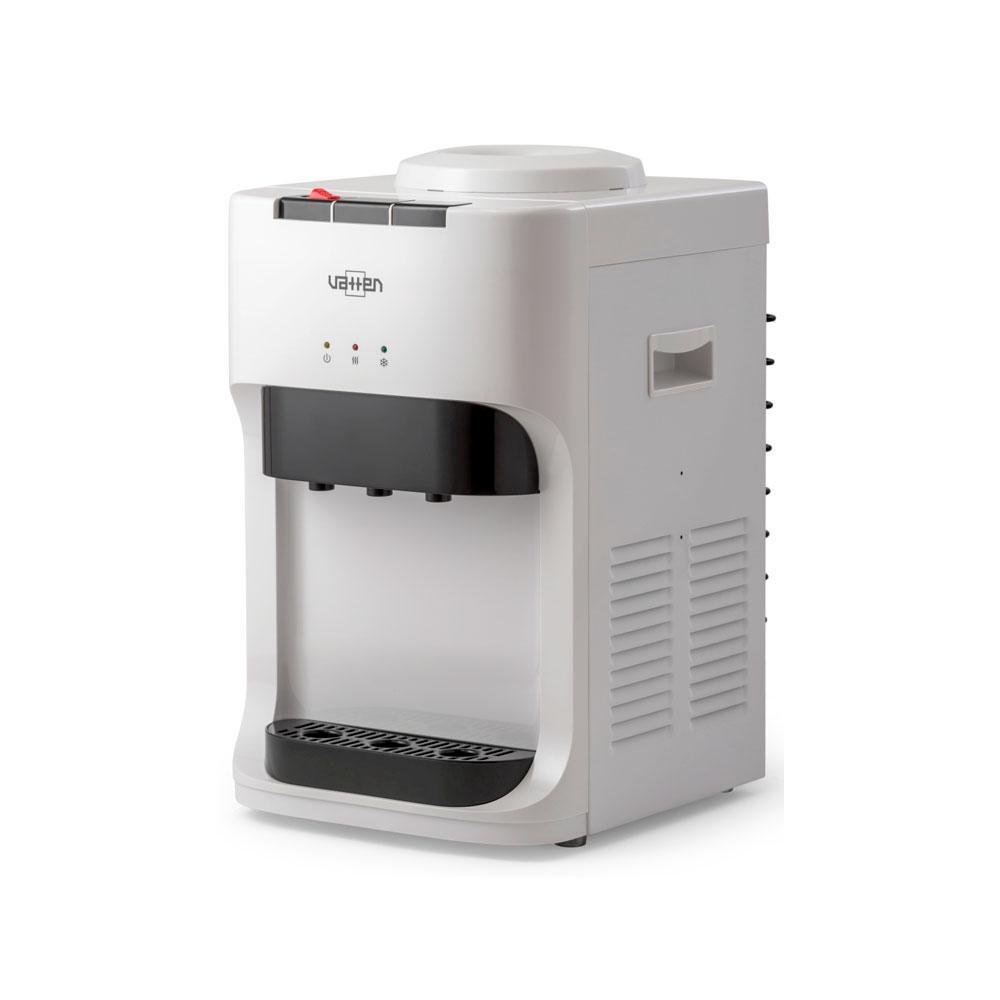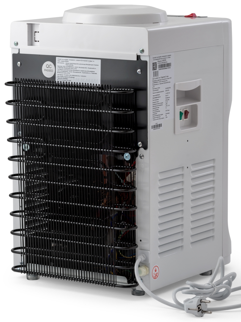 Настольный кулер для воды. С компрессорным охлаждением и с высокой производительностью нагрева воды — до 5.5 литров в час. Для дома. Для офиса. Три крана, управление кнопками — горячая, холодная и вода комнатной температуры. Цвет корпуса белый. Бутылеприёмник, верхняя и передняя панели изготовлены из высококачественного, устойчивого к ультрафиолету ABS пластика. Баки горячей и холодной воды из нержавеющей стали. Три LED индикатора (включение питания, индикатор нагрева, индикатор охлаждения).