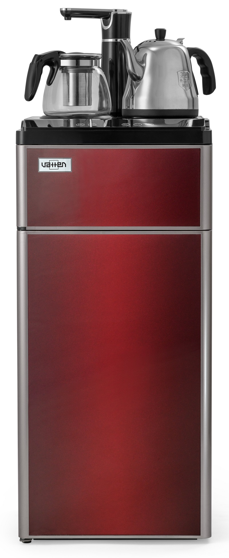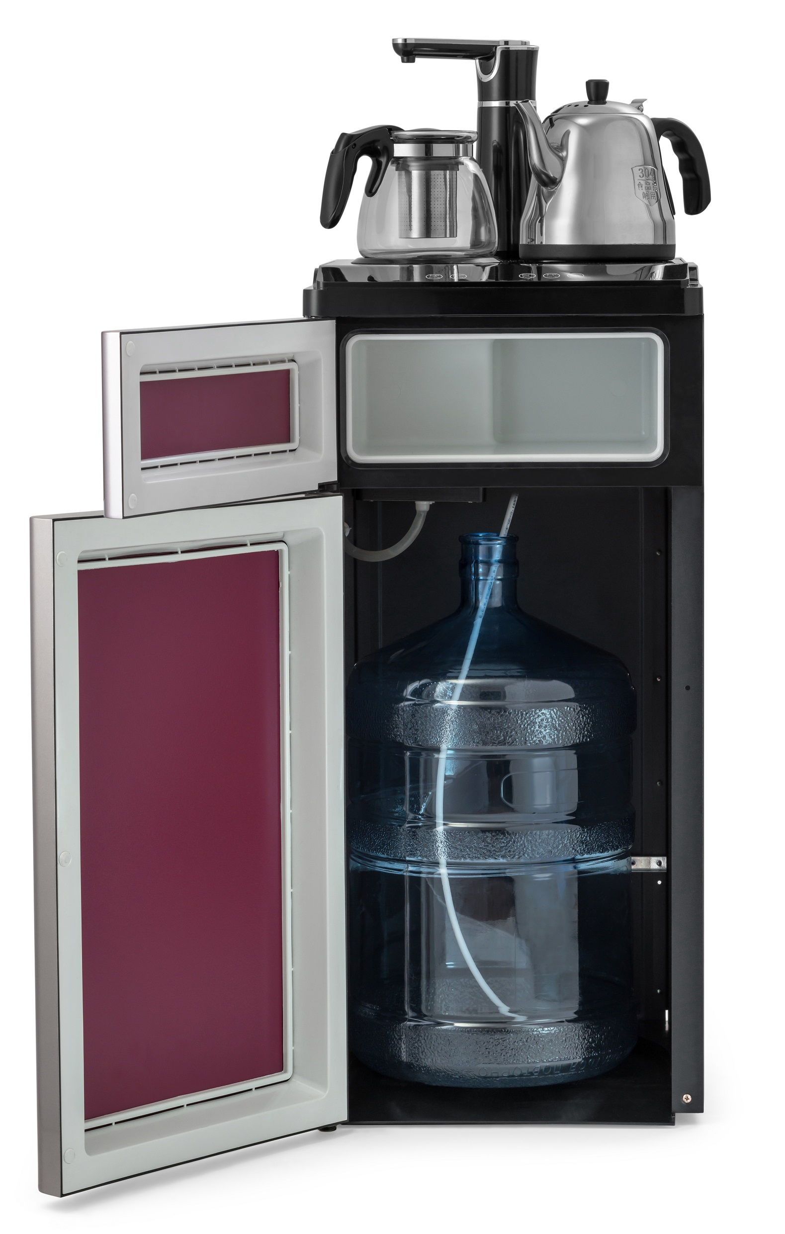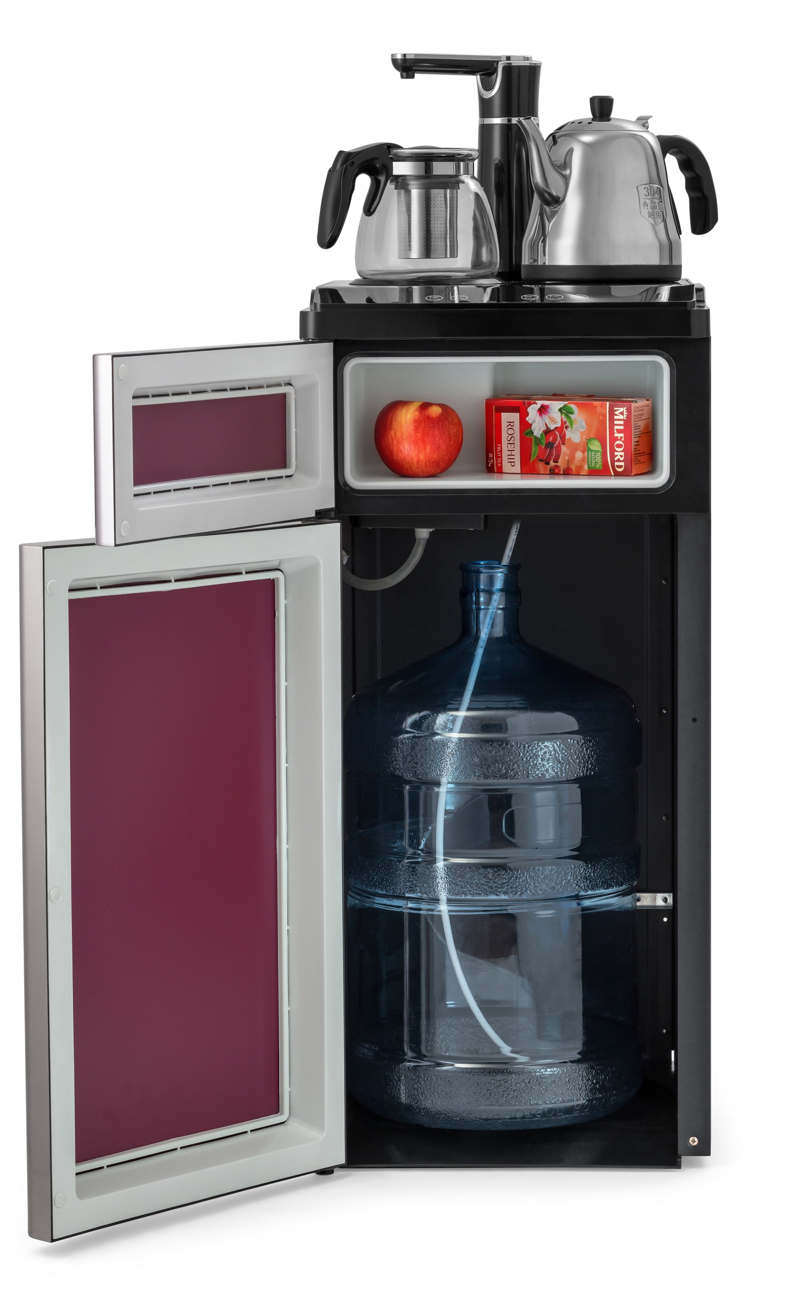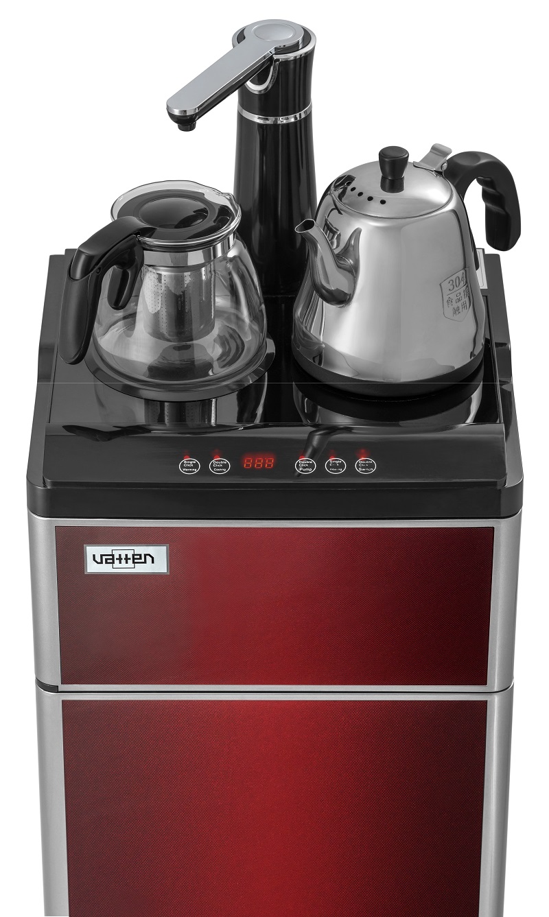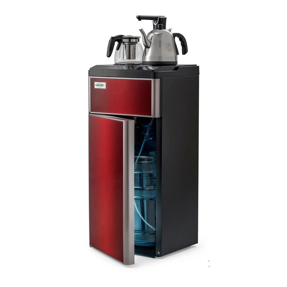Техническая новинка кулера с нижней загрузкой бутыли — кулер сделанный по схеме «tea bar» («чайный столик» — тиабар). Подача воды осуществляется через кран, установленный в верхней части аппарата.Кулер оснащен двумя чайниками: для заварки чая и для кипячения воды. Чайник для заварки имеет свое ложе для подогрева и поддержания температуры. В чайнике для кипячения вода начинает нагреваться после двойного нажатия на кнопку нагрева. Нагрев отключается при достижении 100 °С. Встроенный дисплей отображает текущую температуру воды. Если вода в чайнике остыла, можно включить нагрев соответствующей кнопкой. Шкафчик для хранения посуды и продуктов находиться под верхней панелью. Бутыль устанавливается в нижний шкафчик.
