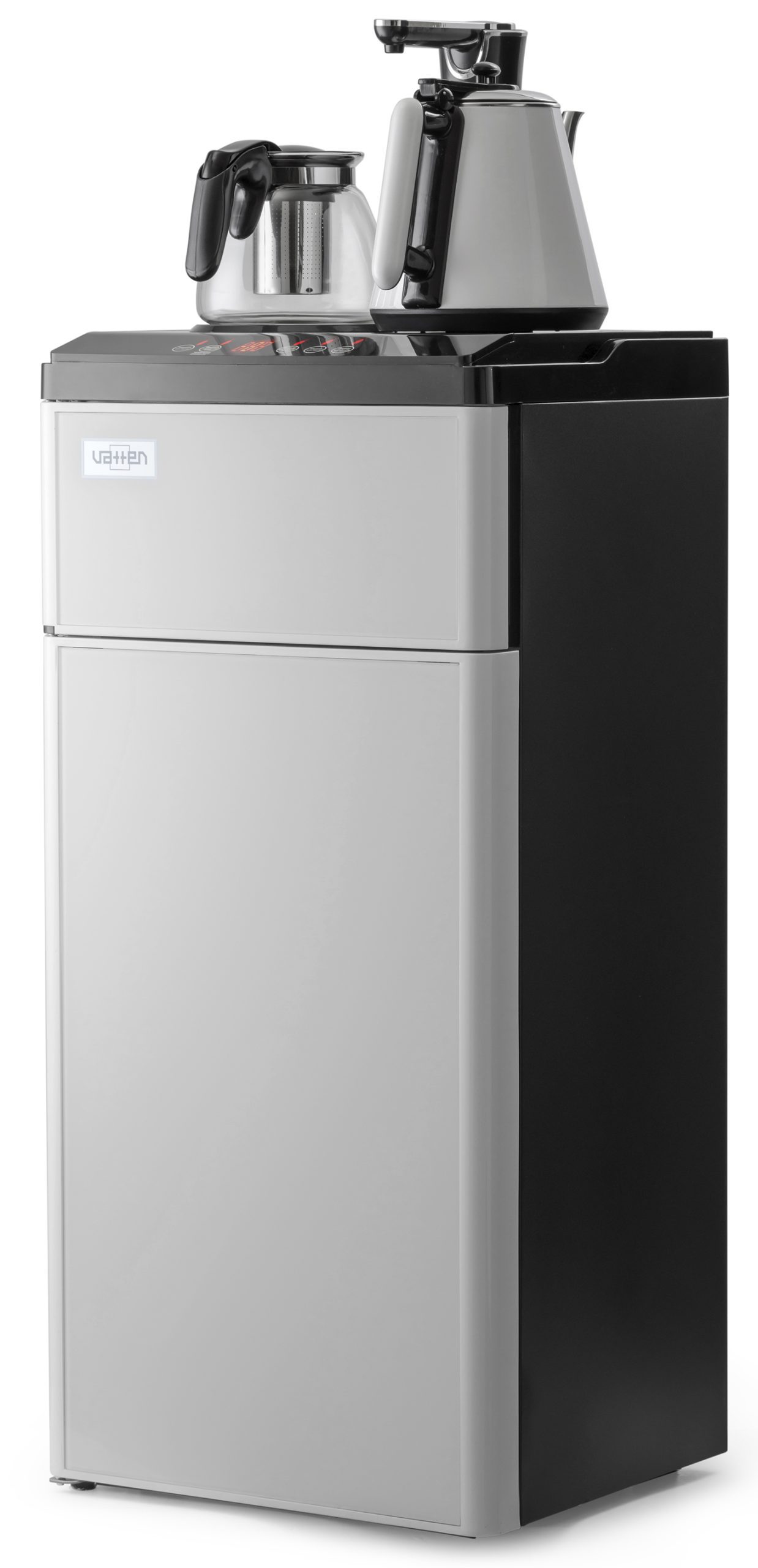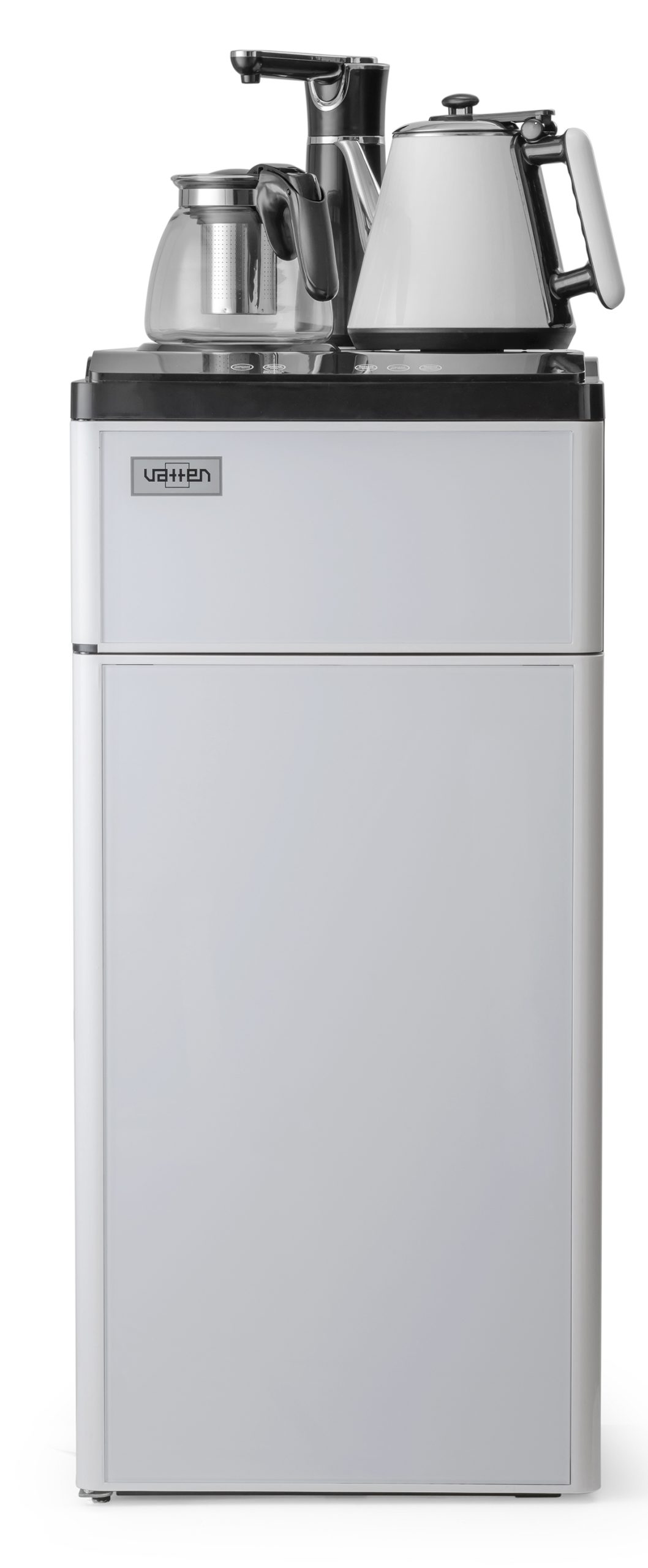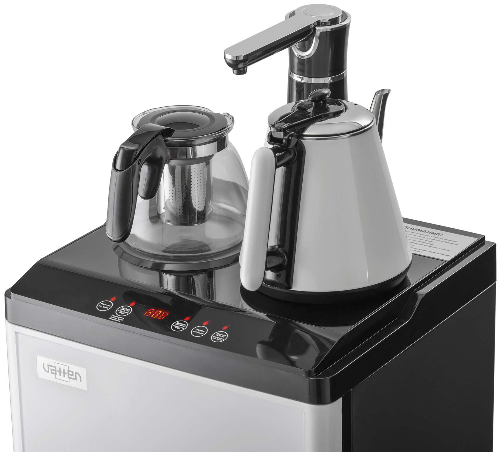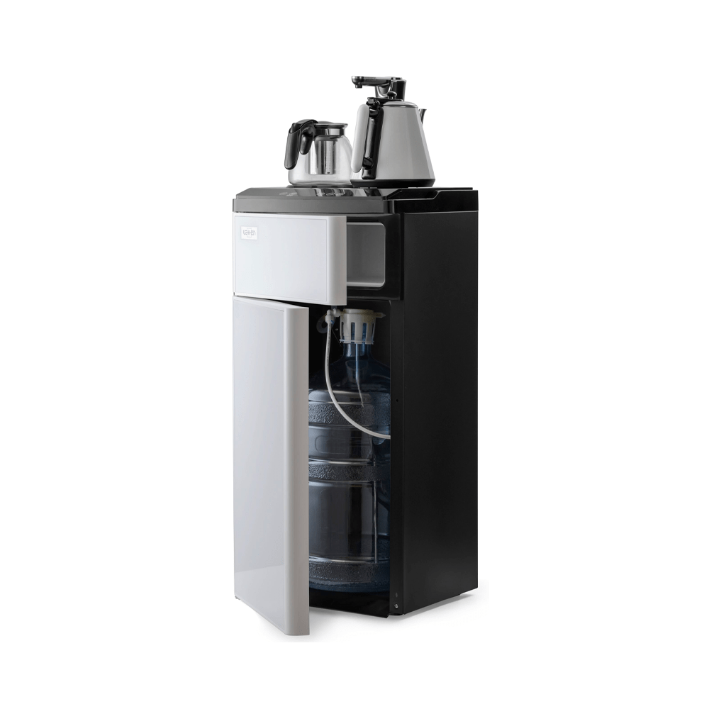 Техническая новинка кулера с нижней загрузкой бутыли — кулер сделанный по схеме «tea bar» («чайный столик» — тиабар). Подача воды осуществляется через кран, установленный в верхней части аппарата. Кулер оснащен двумя чайниками: для заварки чая и для кипячения воды. Чайник для заварки имеет свое ложе для подогрева и поддержания температуры. В чайнике для кипячения вода начинает нагреваться после двойного нажатия на кнопку горячей воды. Нагрев отключается при достижении 100 °С. Встроенный дисплей отображает текущую температуру воды. Если вода в чайнике остыла, можно включить нагрев соответствующей кнопкой. Холодная вода подается из того же крана с помощью специальной кнопки. Шкафчик для хранения посуды и продуктов находиться под верхней панелью. Бутыль устанавливается в нижний шкафчик.