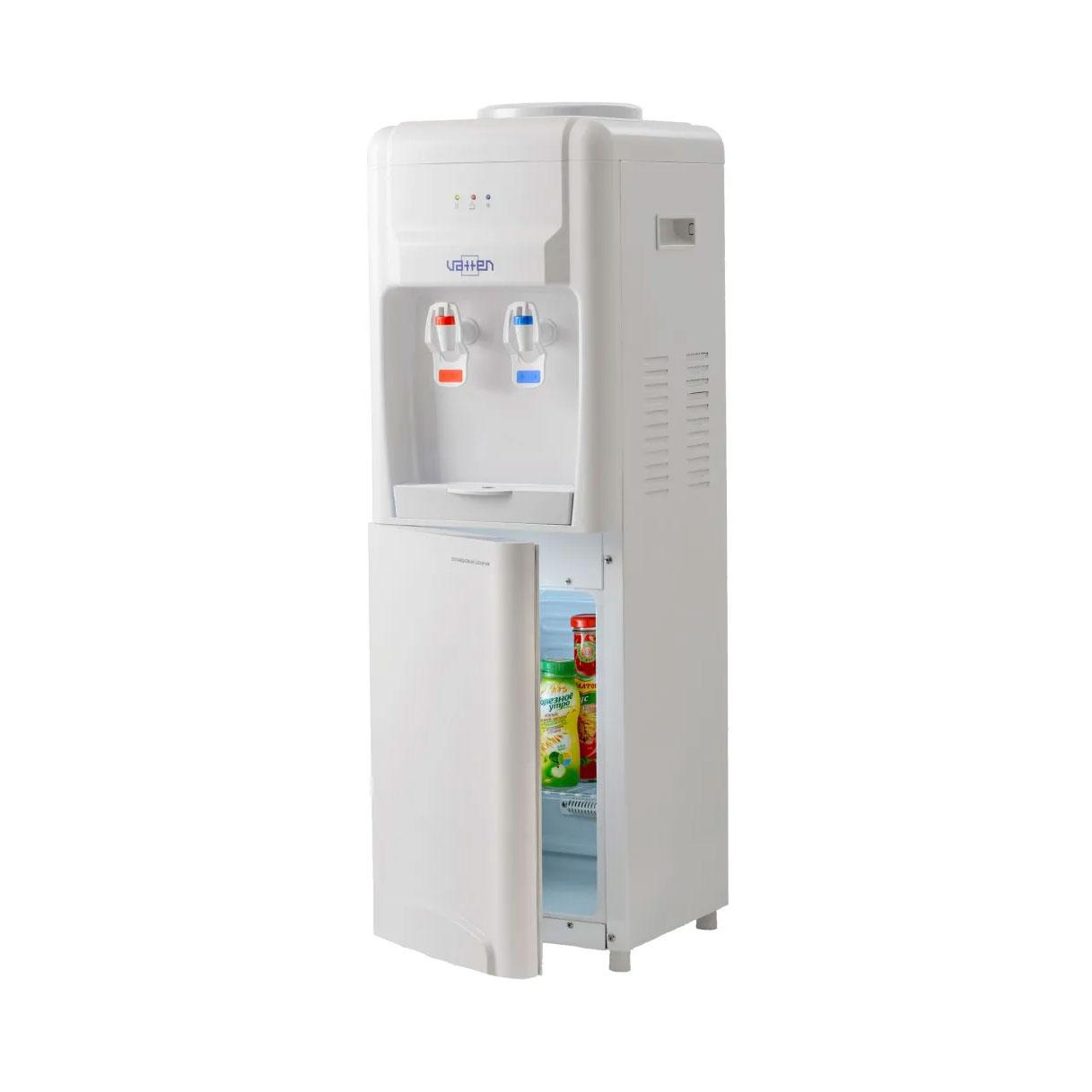 Напольный кулер для воды c холодильной камерой. С компрессорным охлаждением и с производительностью нагрева воды — до 5 литров в час (мощность водонагревателя 500 Вт). Подходит для дома и офиса.