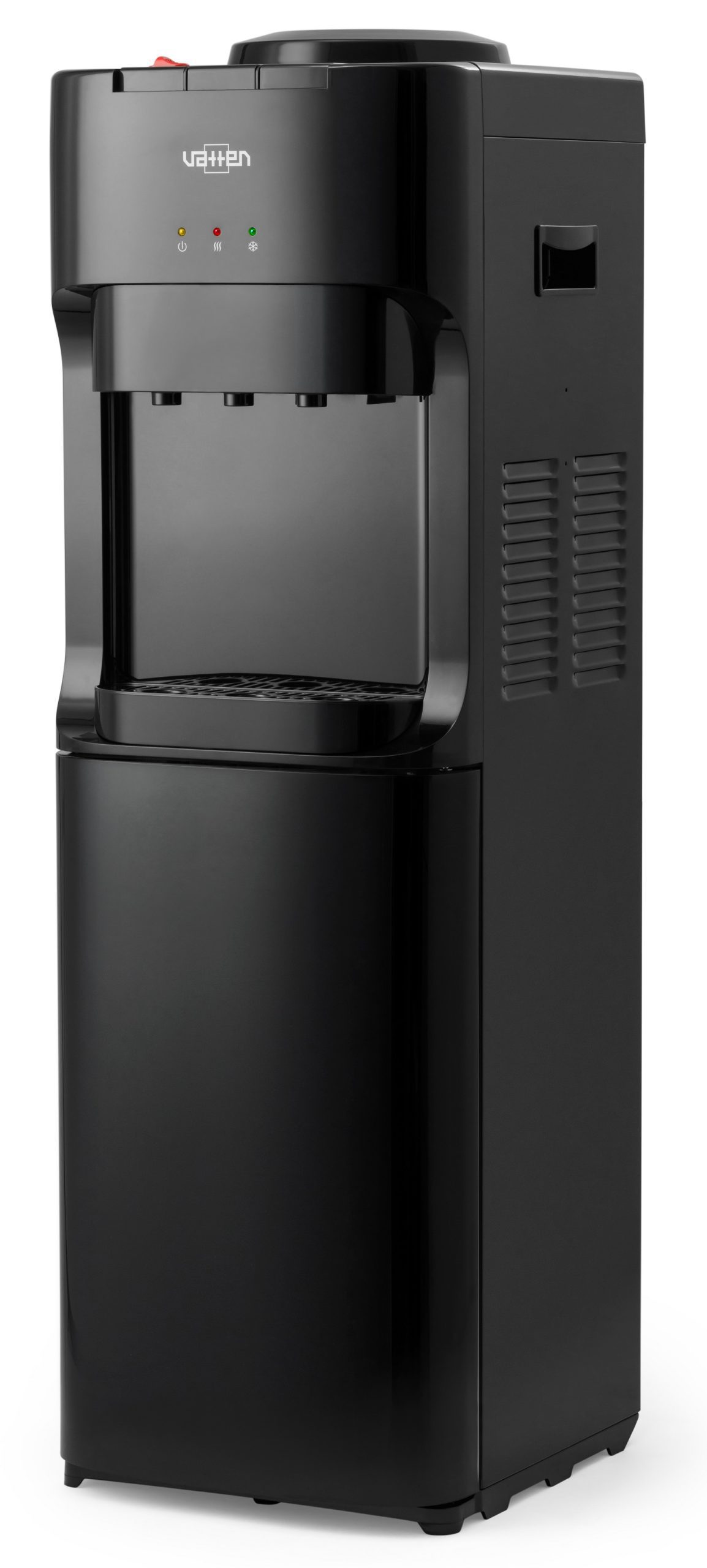 Напольный кулер для воды. С компрессорным охлаждением и с высокой производительностью нагрева воды — до 6 литров в час (мощность водонагревателя 650 Вт). Шкафчик — холодильник 20л. Высота стандартная — 928 мм. Для дома. Для офиса. Три крана, управление кнопками — горячая, холодная и вода комнатной температуры. Цвет корпуса черный. Бутылеприёмник, верхняя и передняя панели изготовлены из высококачественного, устойчивого к ультрафиолету ABS пластика. Боковые панели стальные. Баки горячей и холодной воды из нержавеющей стали. Три LED индикатора (включение питания, индикатор нагрева, индикатор охлаждения — power, hot, frost).