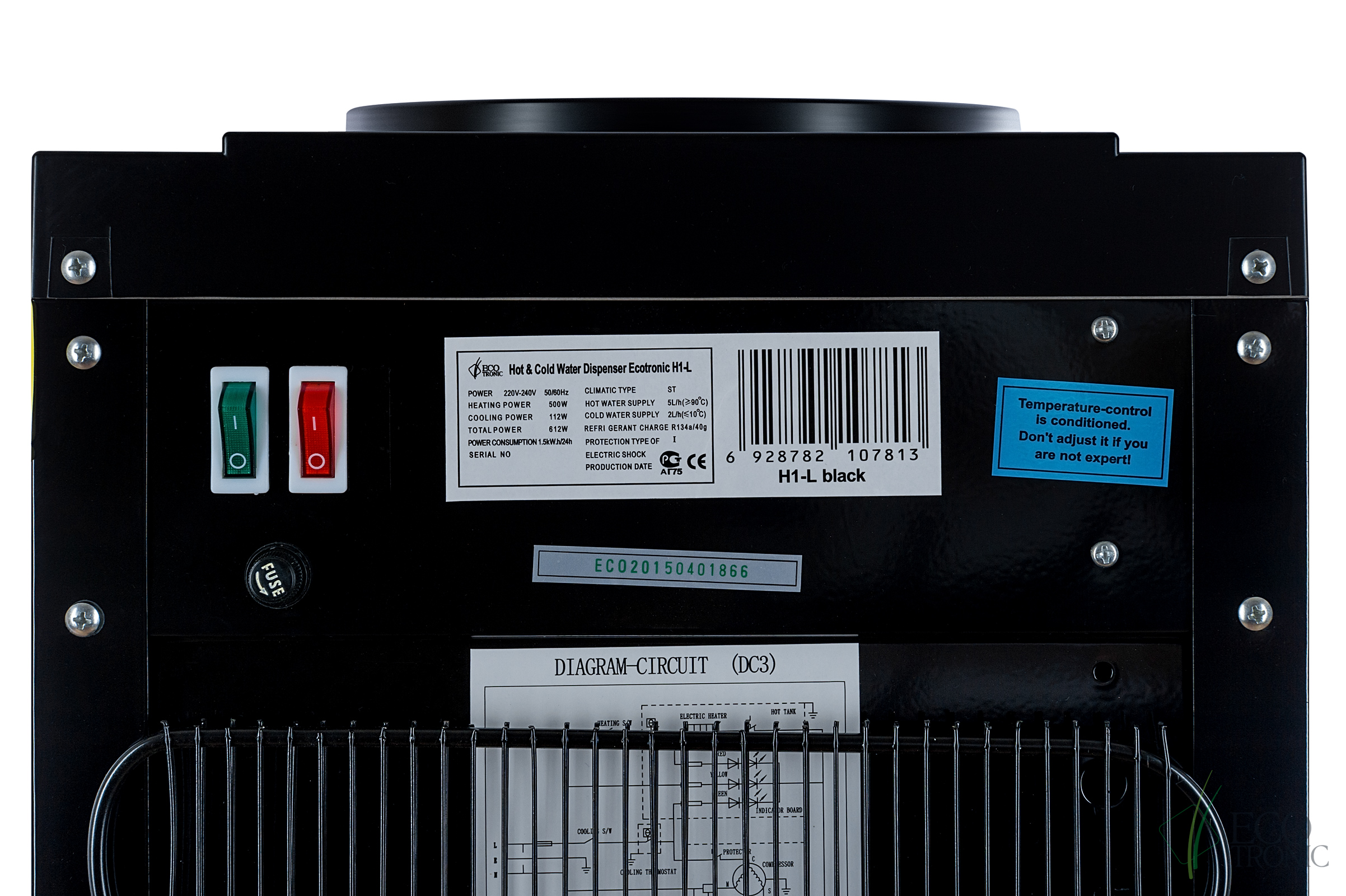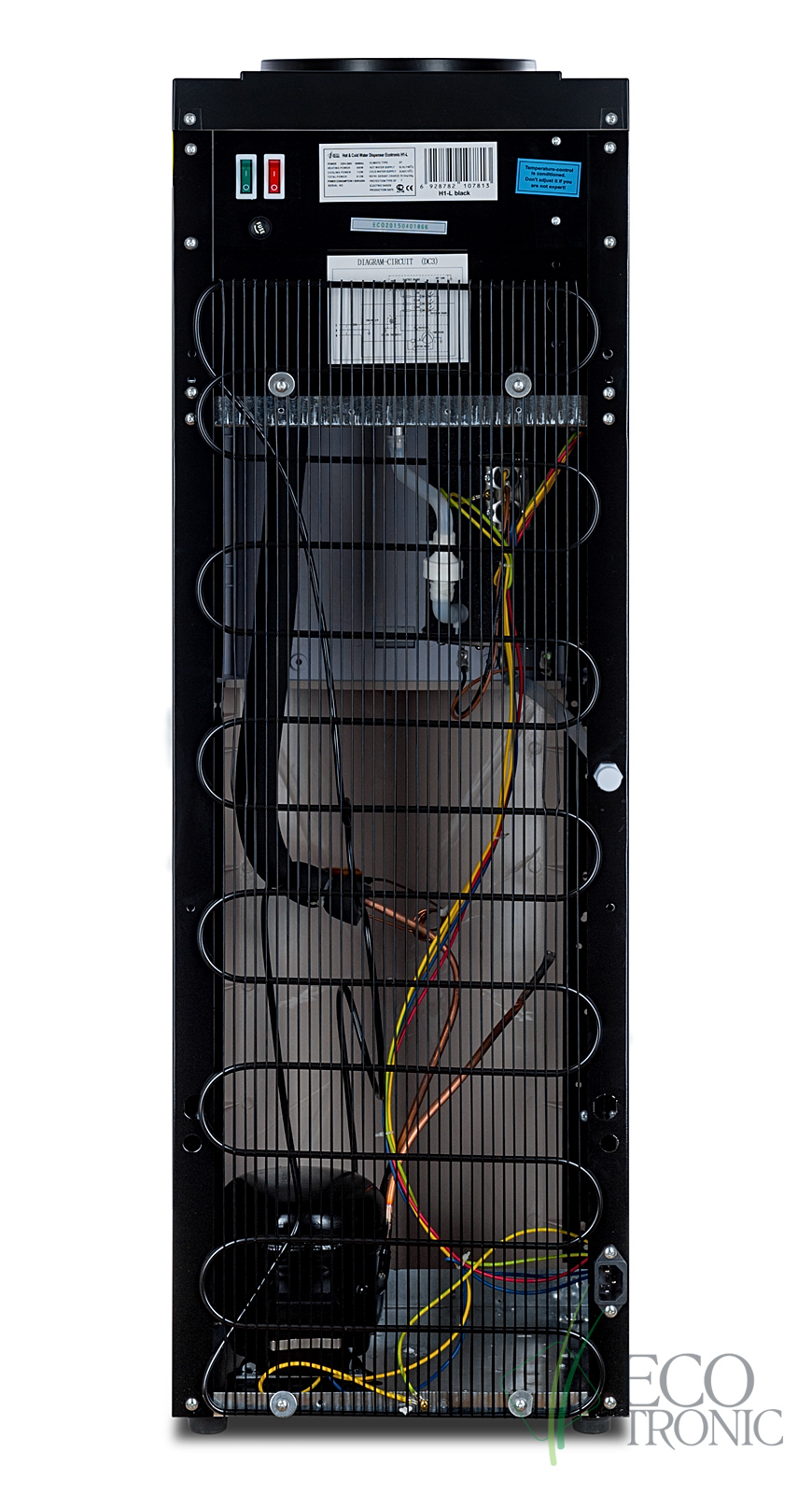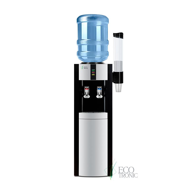 Кулер Ecotronic H1-L Black. Напольный кулер черного цвета с серебряной вставкой и с компрессорным охлаждением. Тип кранов подачи воды — «Нажим кружкой». Отличие от дешевых аналогов — разборный бак горячей воды (не сварной) для простого и не дорогого ремонта в дальнейшем, цельнотянутый (не сварной) нержавеющий бак холодной воды для долгой эксплуатации, штуцеры кранов из нержавеющей стали, компрессоры китайских брендов высшего дивизиона Хуайю или Данфу с медной оплеткой (не дешевый алюминий) для эффективной, менее шумной и долгой эксплуатации. Сложное разборное гнездо с функцией защиты от протечек и со съемной иглой. Выбирайте настоящий Ecotronic, а не дешевые аналоги.