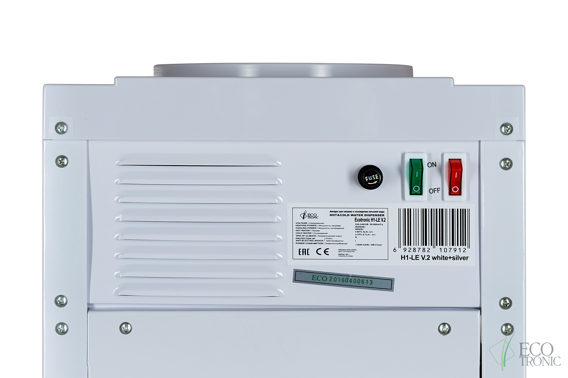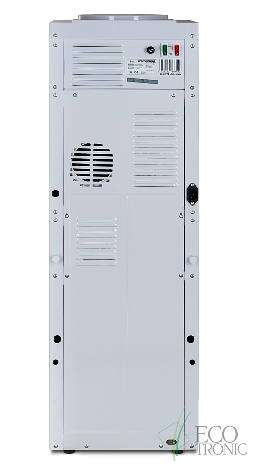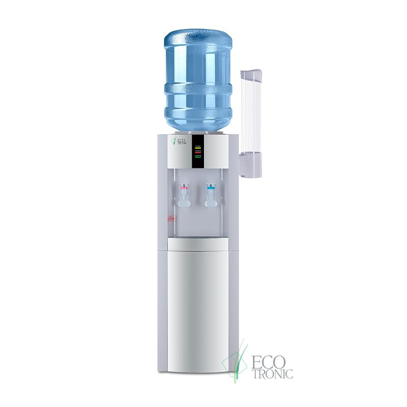 Кулер Ecotronic H1-LE White v.2 . Напольный кулер белого цвета с серебряной вставкой и с электронным охлаждением. Тип кранов подачи воды — «Нажим кружкой».