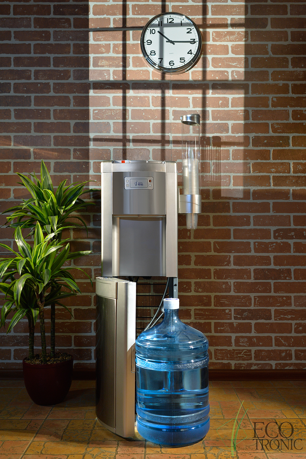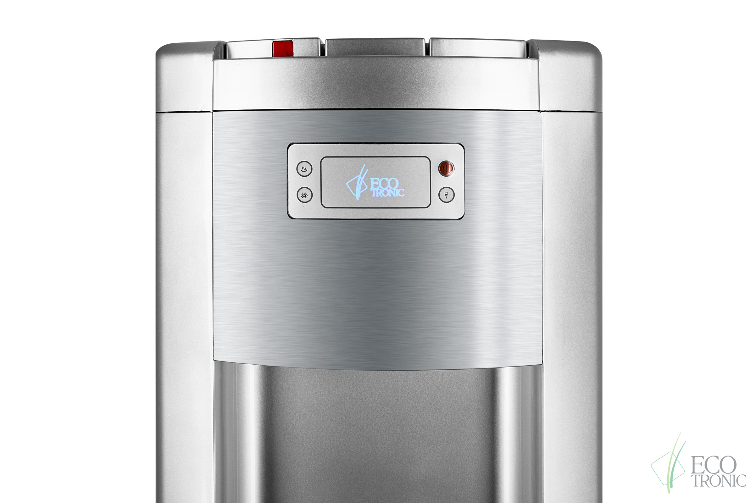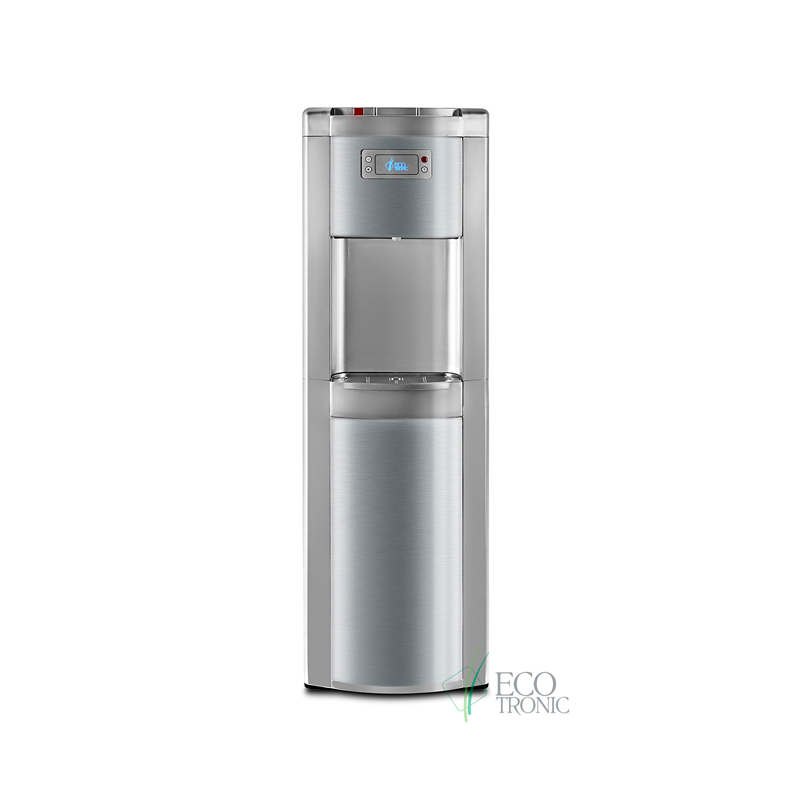 Ecotronic P9-LX Silver — кулер с нижней загрузкой бутыли. Специальная изогнутая, регулируемая по длине заборная трубка позволяет производить забор воды из бутыли без остатка. Три крана подачи воды: горячая, прохладная и холодная. Лоток со встроенным поплавком, сигнализирующим о заполнении. Закачка воды в систему кулера происходит с помощью водной помпы. Выкатная полка отсутствует.