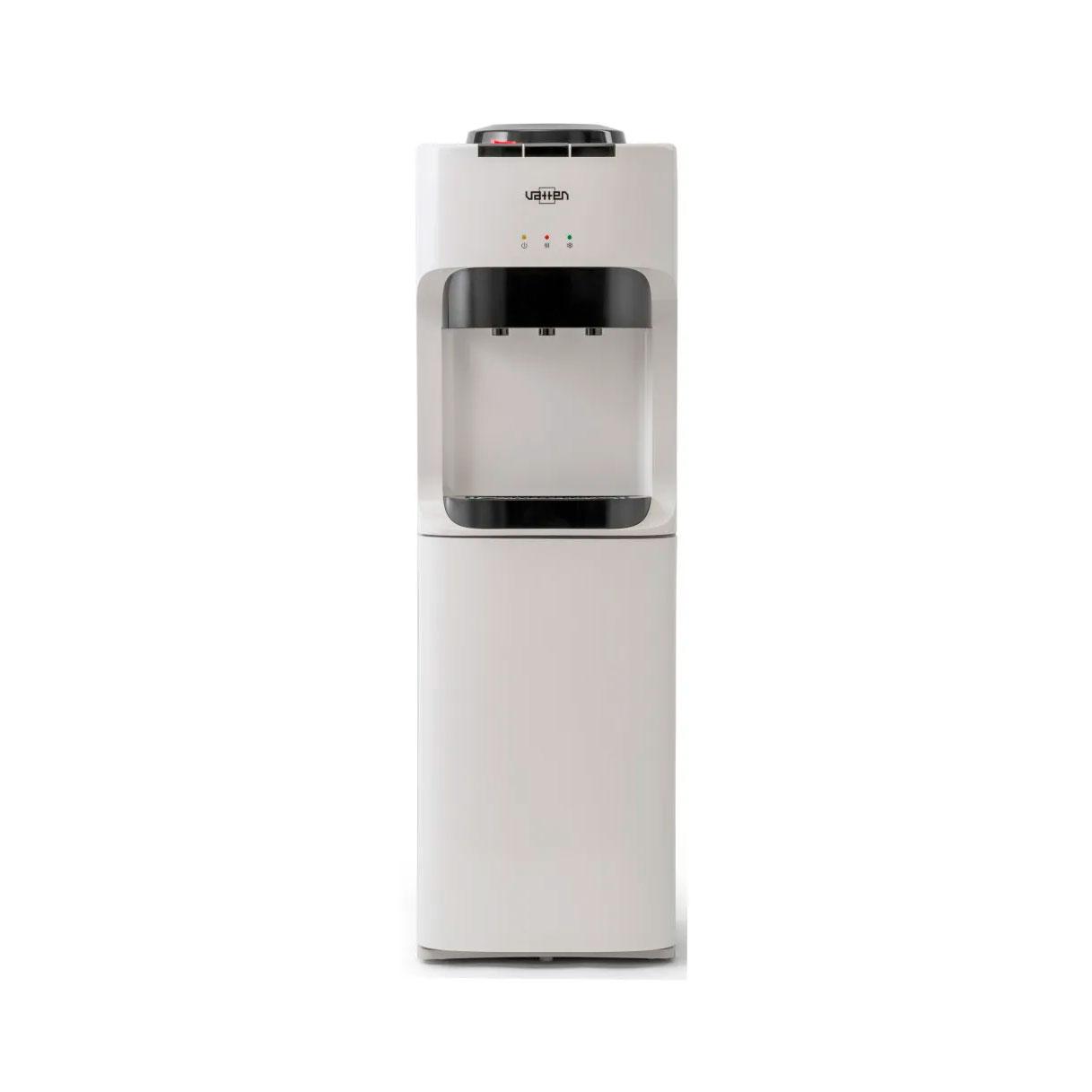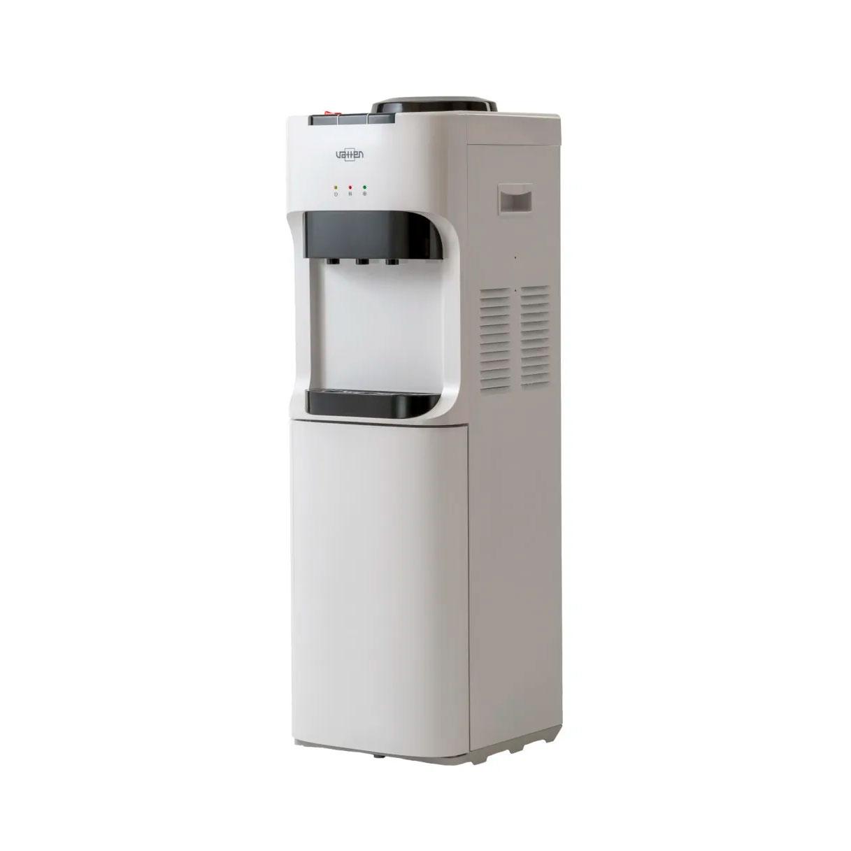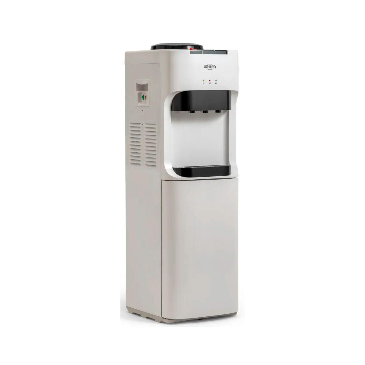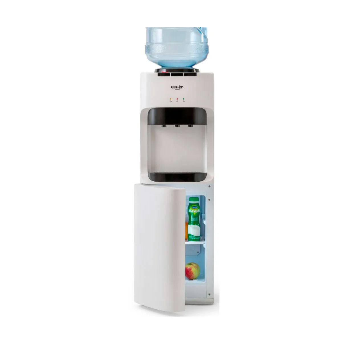 Напольный кулер для воды. С компрессорным охлаждением и с высокой производительностью нагрева воды — до 6 литров в час (мощность водонагревателя 650 Вт). Шкафчик — холодильник 18л. Высота стандартная — 928 мм. Для дома. Для офиса.