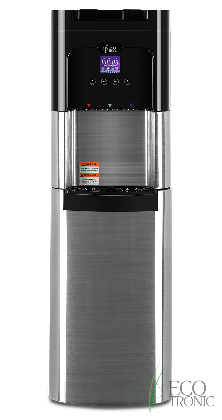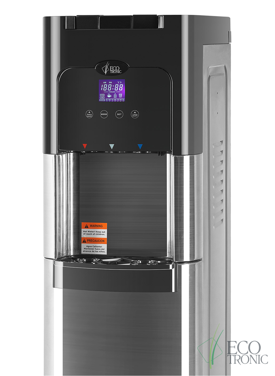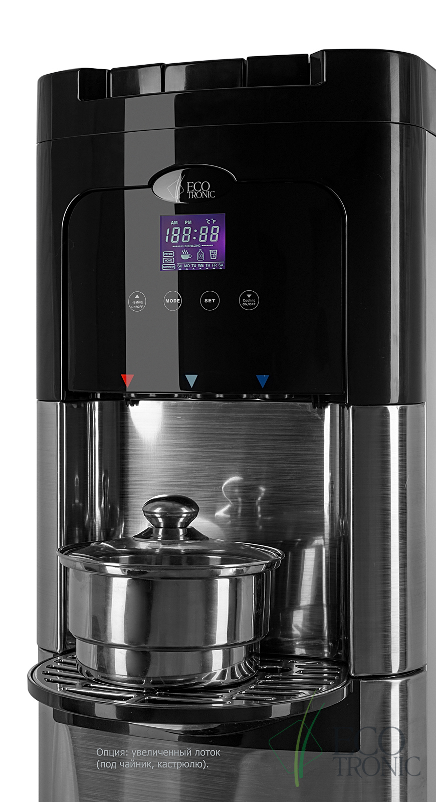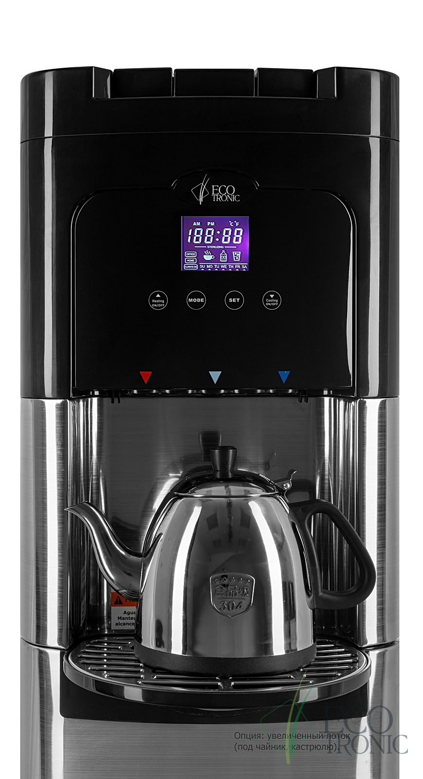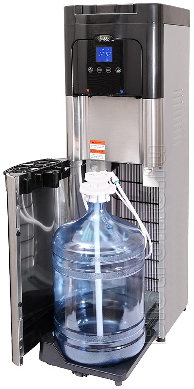 Напольный кулер с нижней загрузкой бутыли, лицевые панели из нержавеющей стали. Монитор с управлением температурой горячей и холодной воды и временем включенияотключения аппарата. Новые модели C11-LXPM поставляются с водяной помпой. Бак гв 2,2 литра с донным нагревателем. Производительность по охлаждению воды, 4л/ч. Пр-во: КанадаКНР.