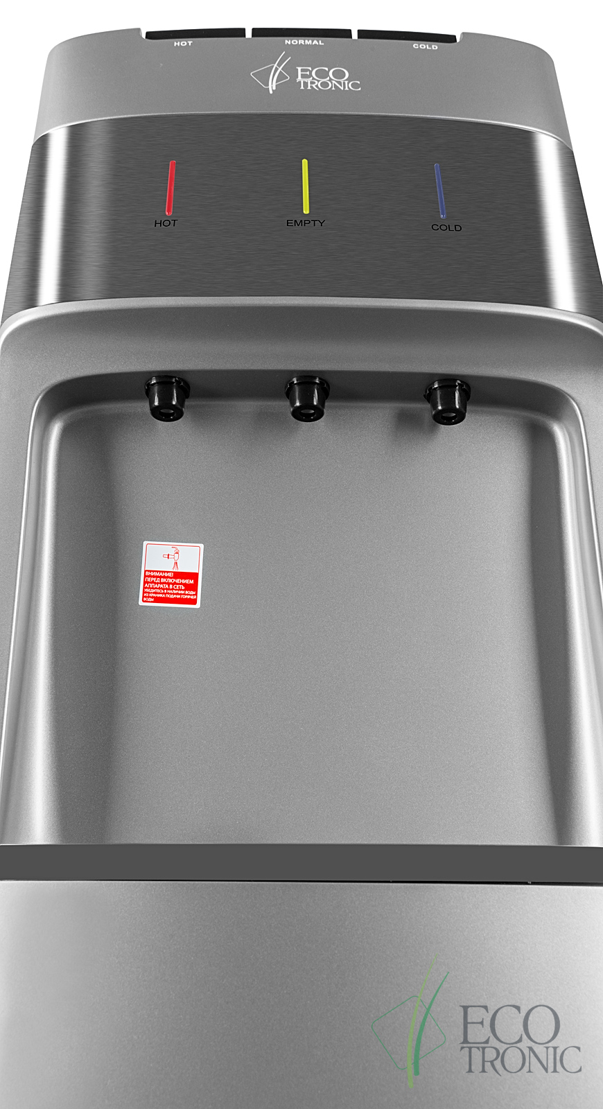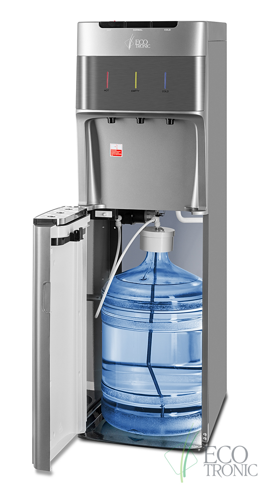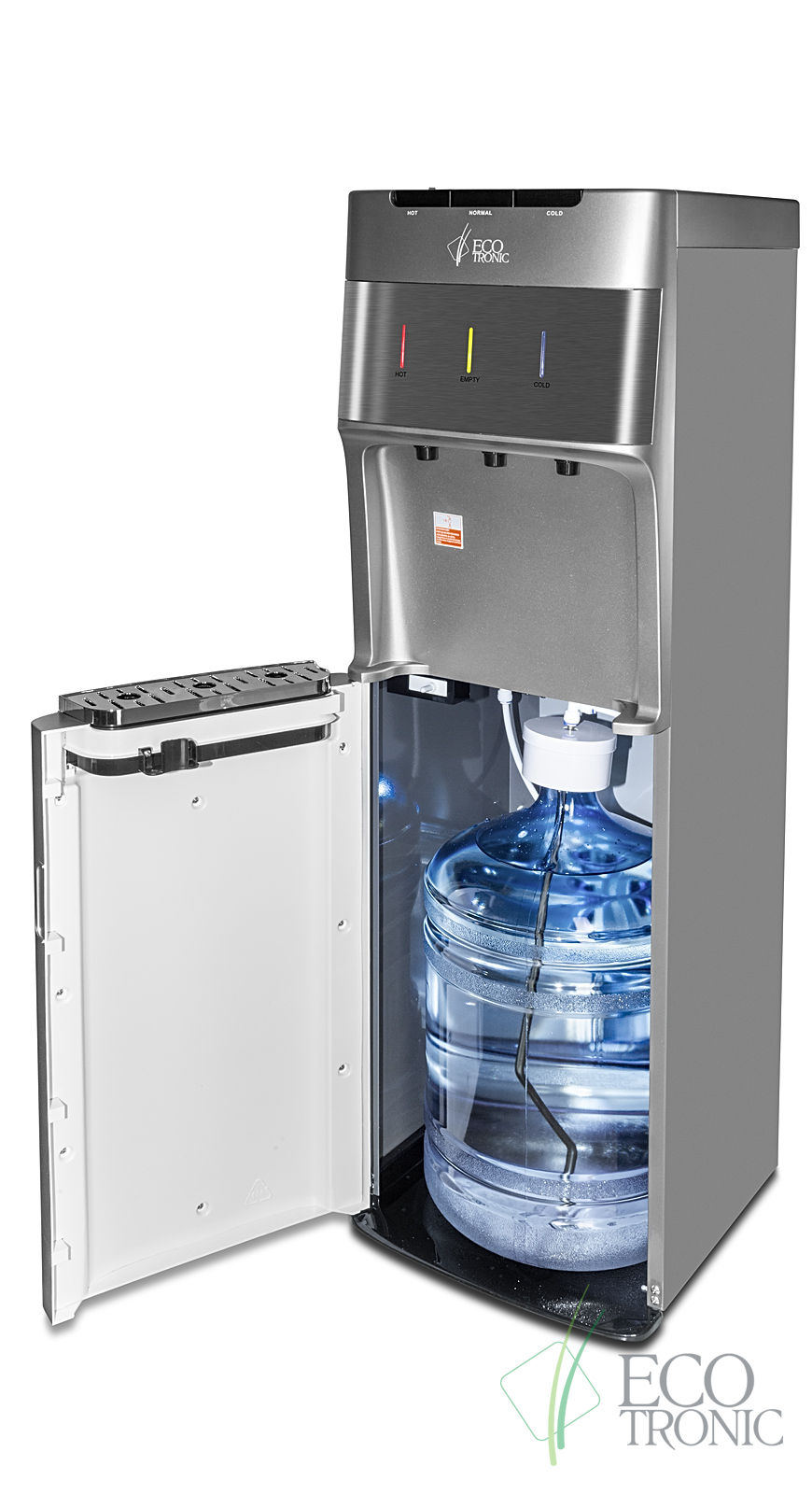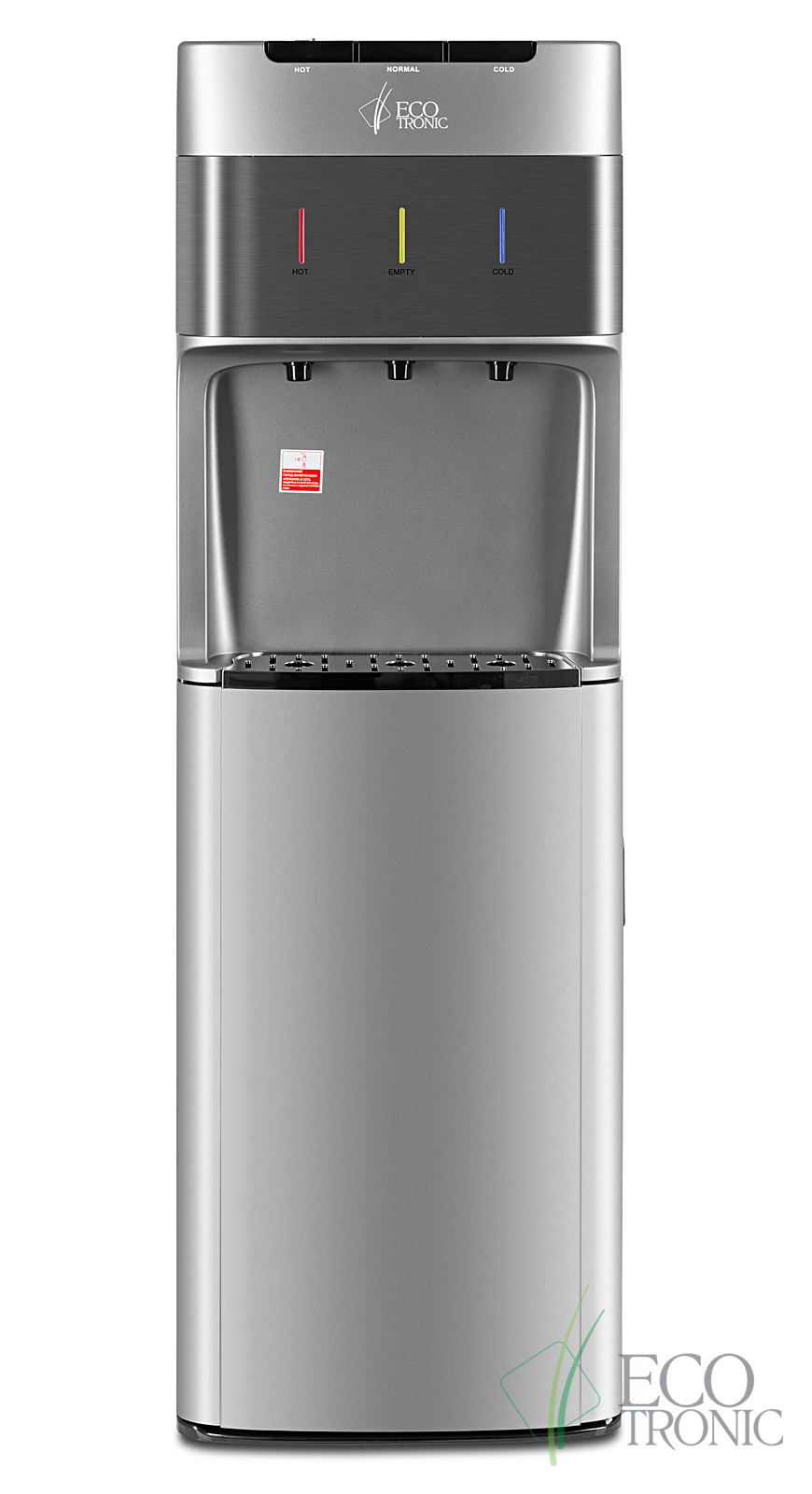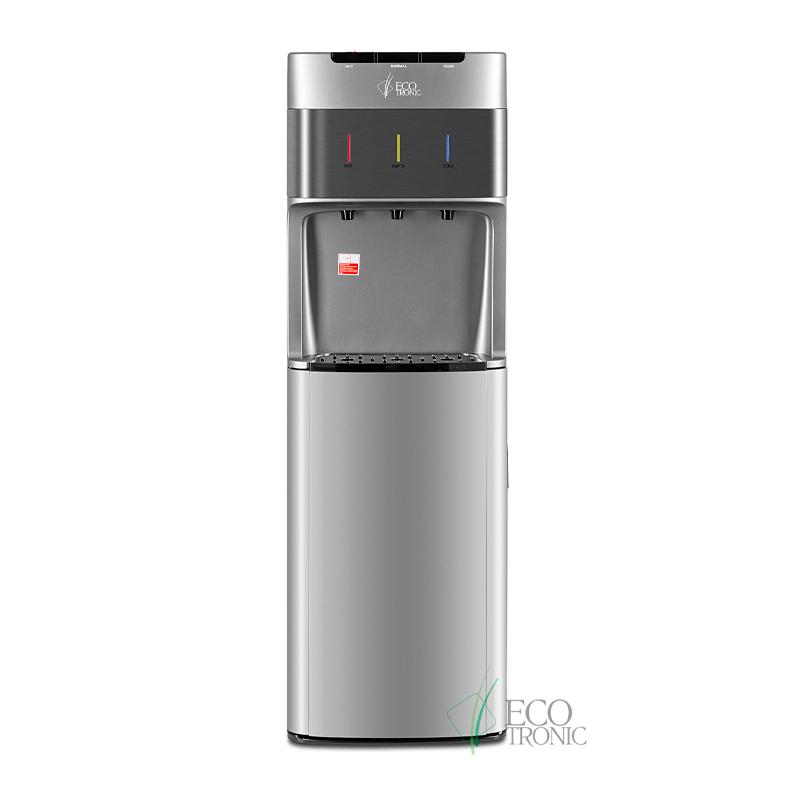 Кулер с нижней загрузкой бутыли и электронным охлаждением. Корпус серебристого цвета со вставкой из нержавеющей стали. 3 клавиши подачи воды (горячая/комнатной температуры/холодная). Клавиша горячей воды с защитой от детей. Индикация режимов нагрева, охлаждения воды, а также индикация отсутствия воды в бутыли. Для быстрой очистки краников применяются съемные гигиенические колпачки. Выключатели нагрева и охлаждения воды.