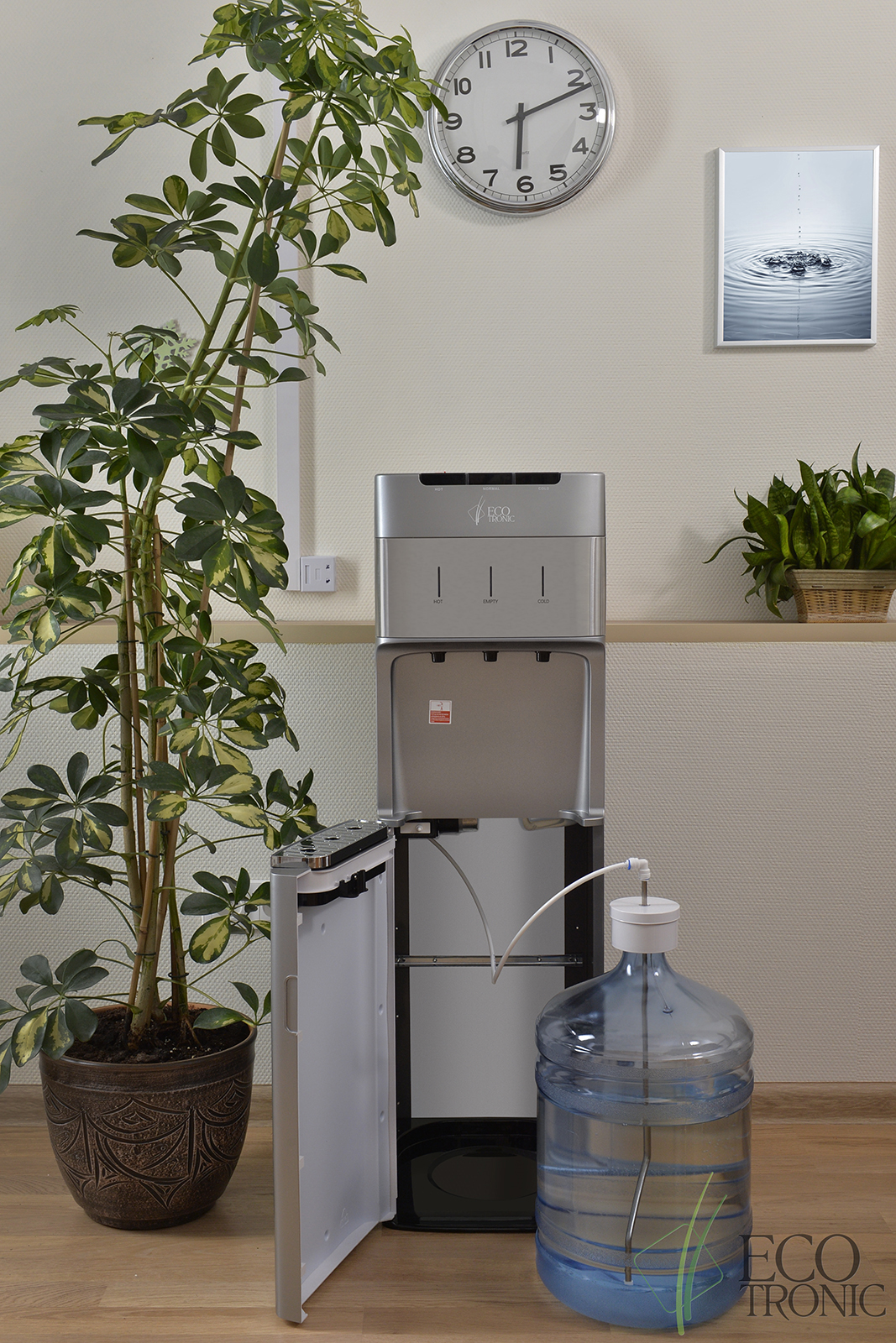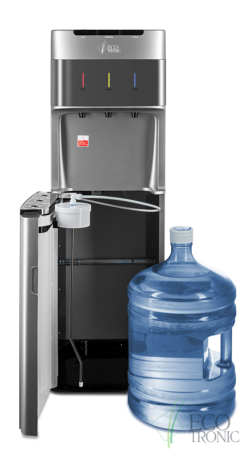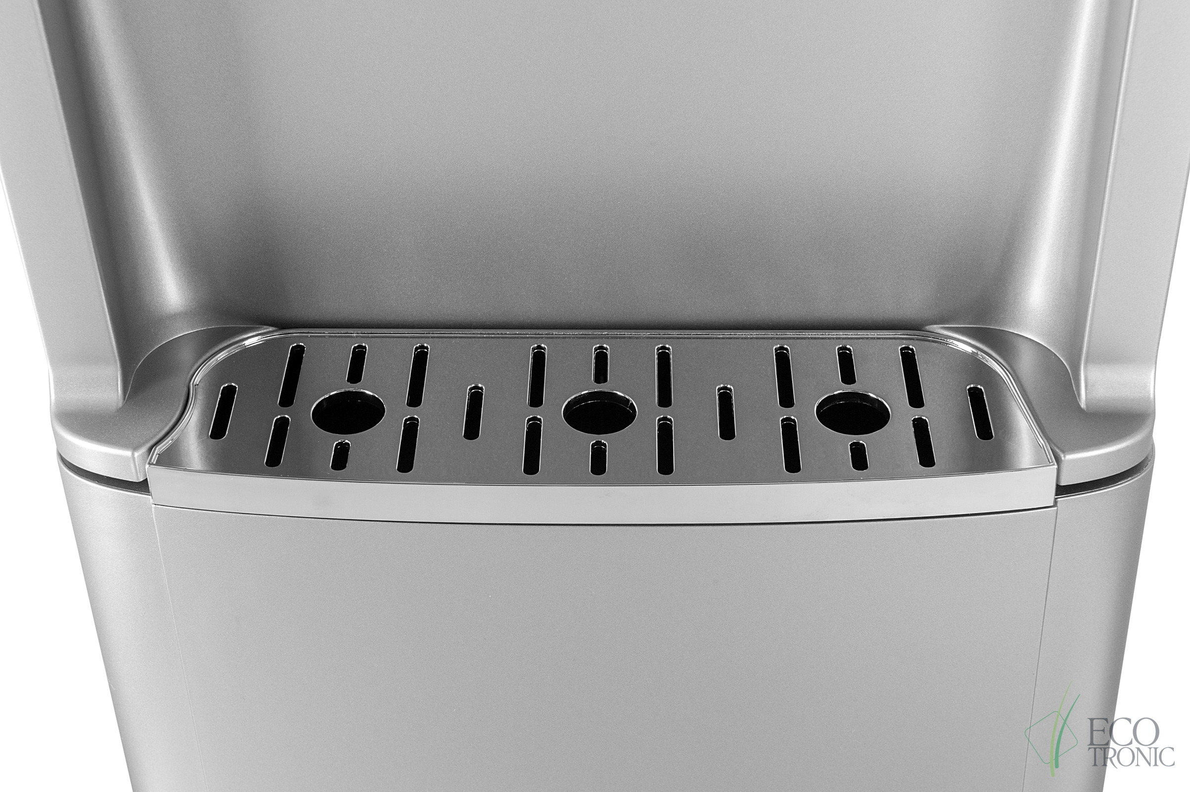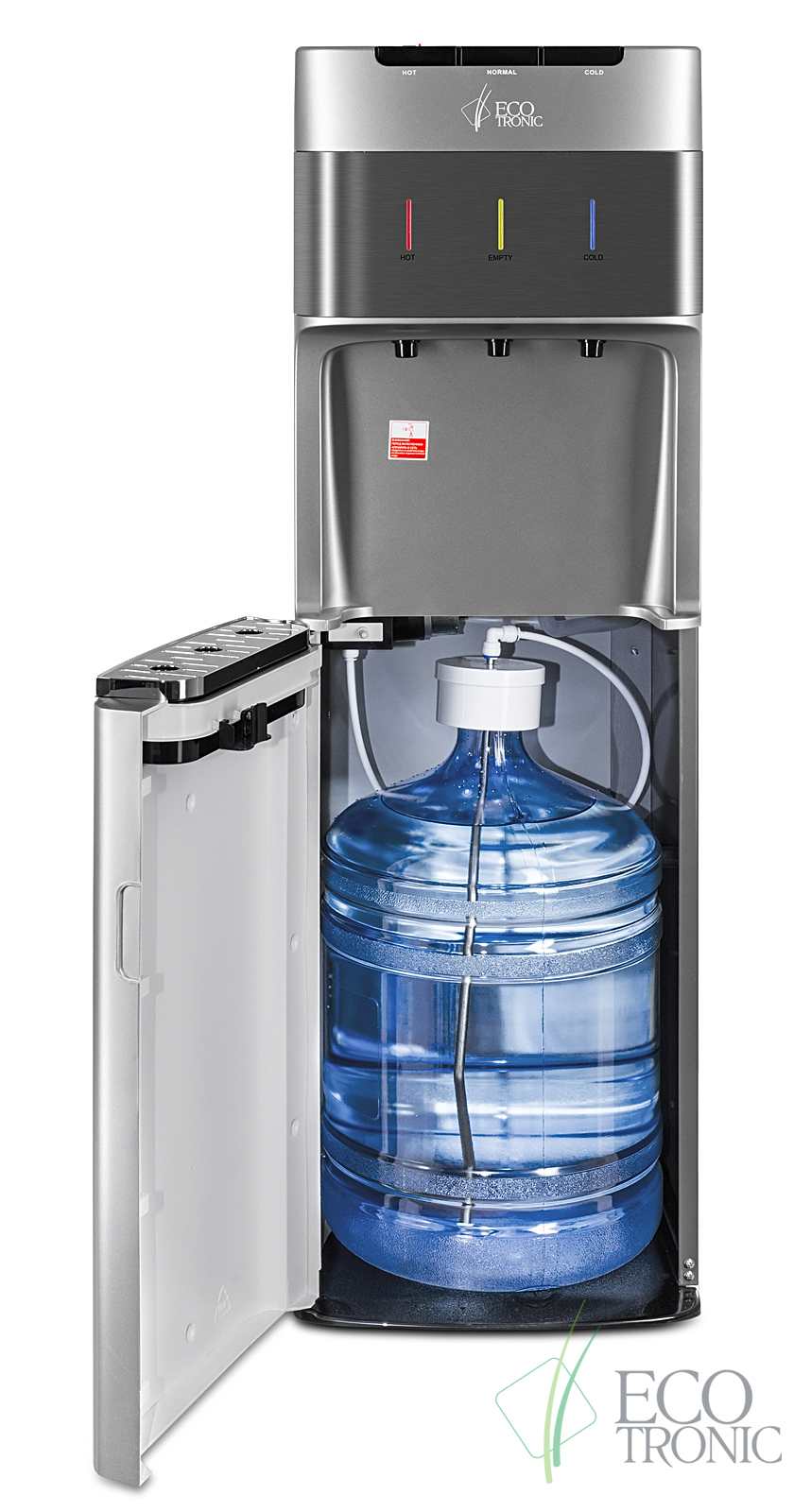Кулер с нижней загрузкой бутыли и электронным охлаждением. Корпус серебристого цвета со вставкой из нержавеющей стали. 3 клавиши подачи воды (горячая/комнатной температуры/холодная). Клавиша горячей воды с защитой от детей. Индикация режимов нагрева, охлаждения воды, а также индикация отсутствия воды в бутыли. Для быстрой очистки краников применяются съемные гигиенические колпачки. Выключатели нагрева и охлаждения воды.