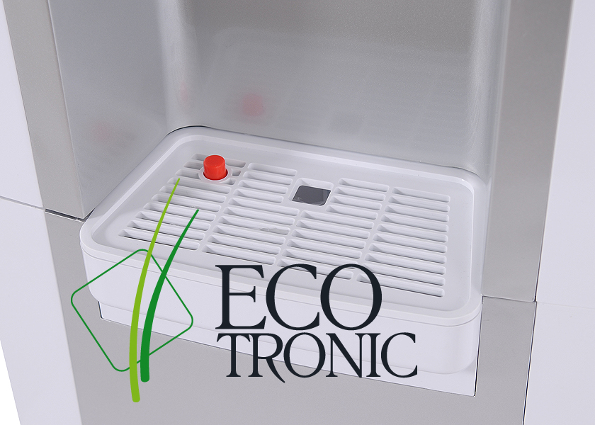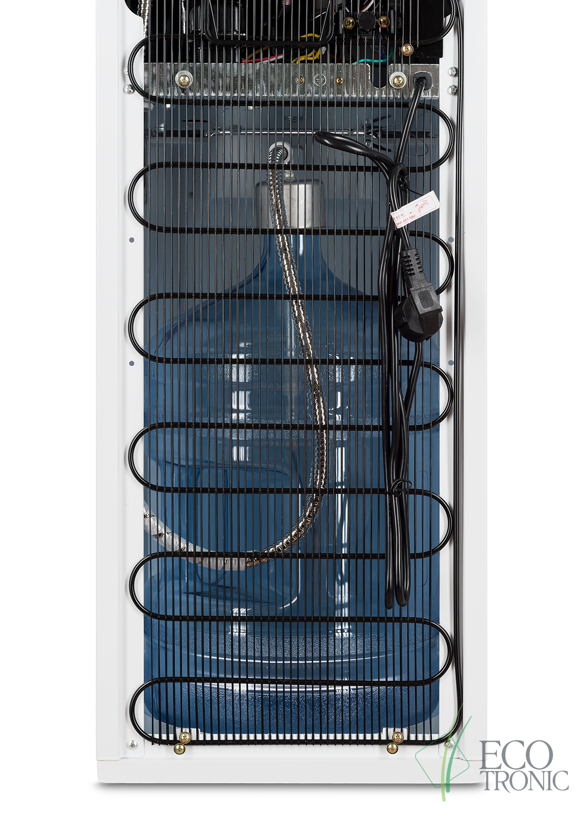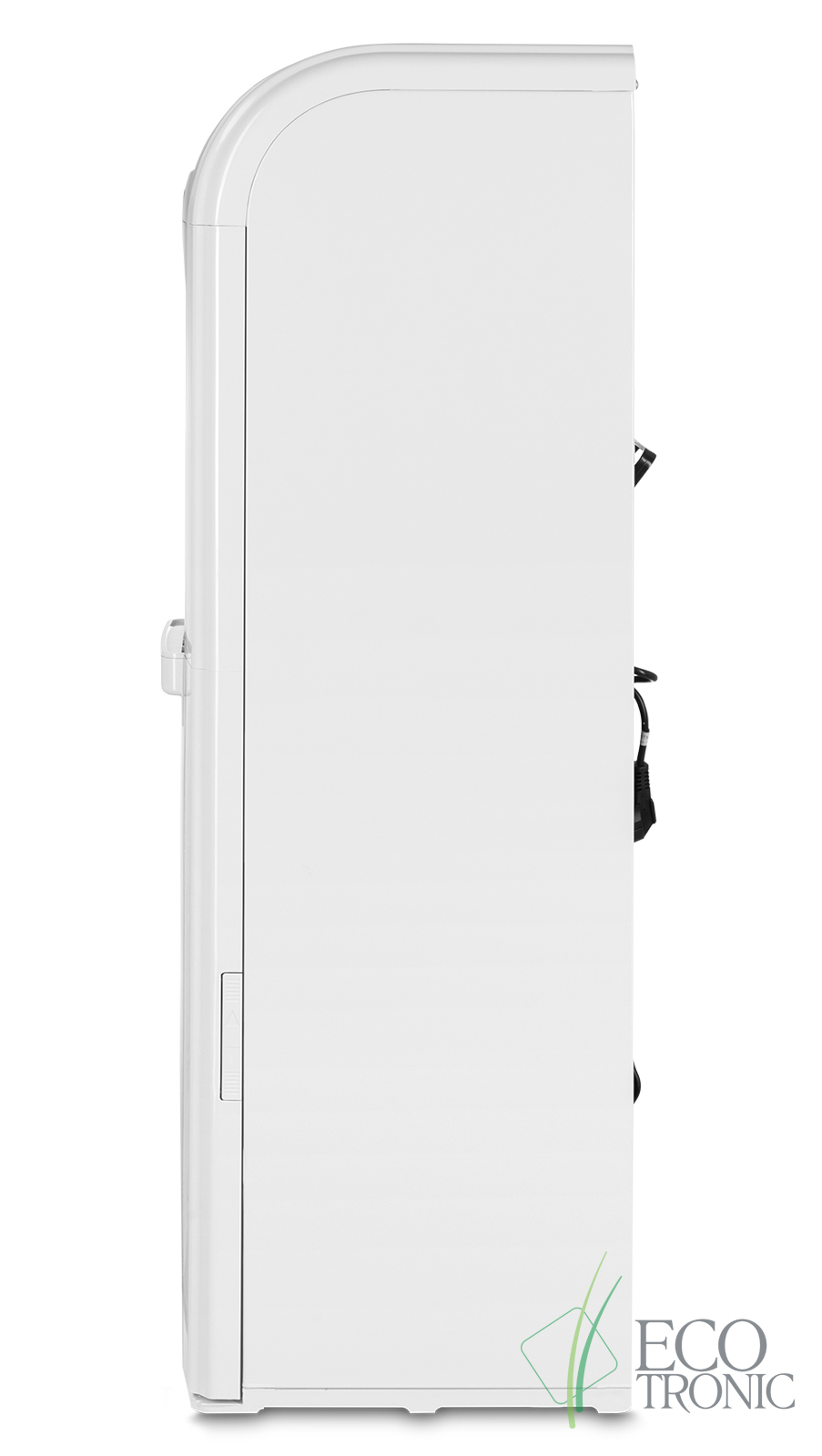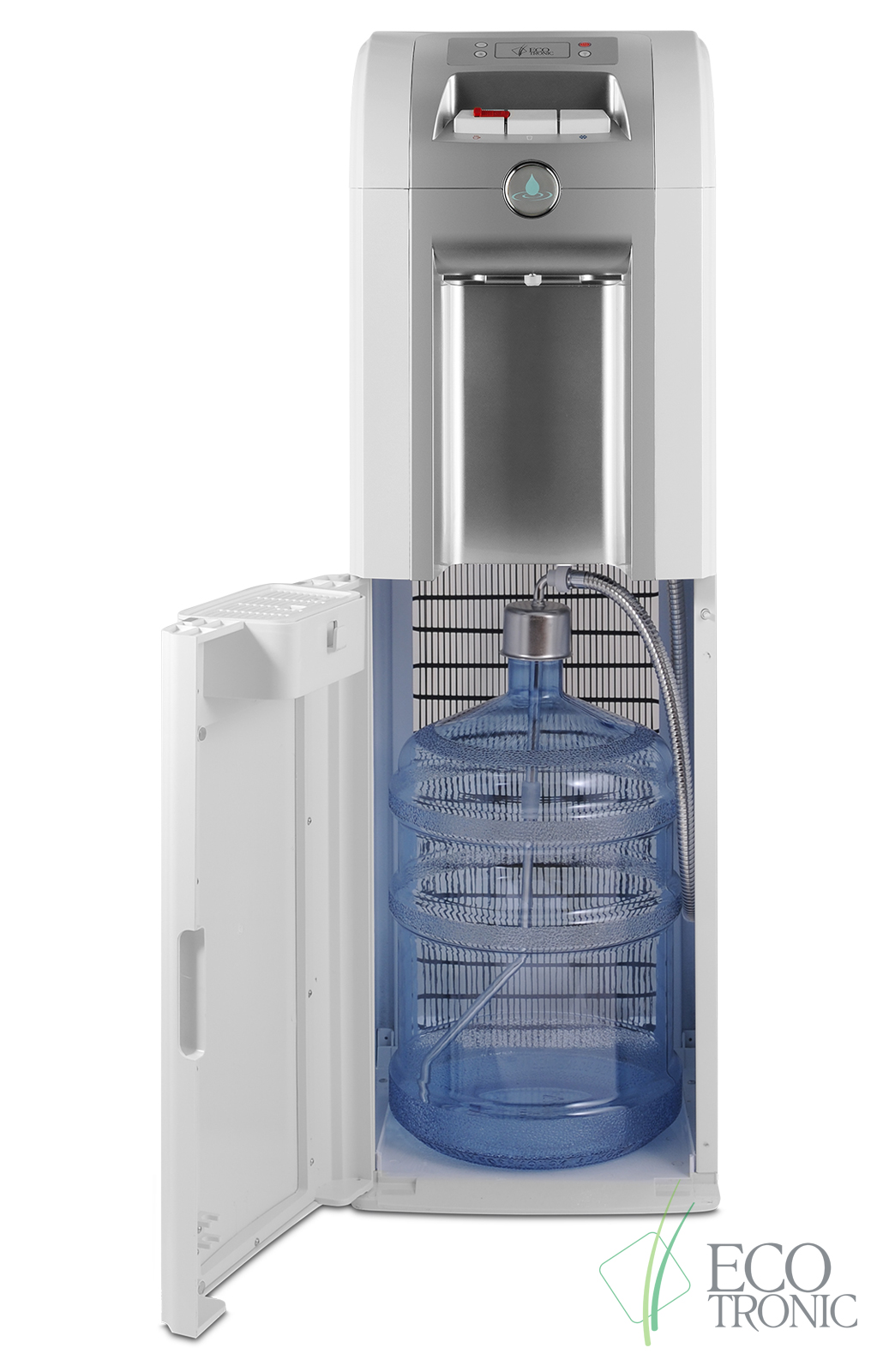 Ecotronic P8-LX White — кулер с нижней загрузкой бутыли. Специальная изогнутая, регулируемая по длине заборная трубка позволяет производить забор воды из бутыли без остатка. Закачка воды в систему кулера происходит с помощью водной помпы. Три крана подачи воды: горячая, прохладная и холодная. Горячий кран с защитой от случайного нажатия (защита от детей). Подсветка отделения для забора воды. Лоток со встроенным поплавком, сигнализирующим о заполнении. Выкатная полка отсутствует.