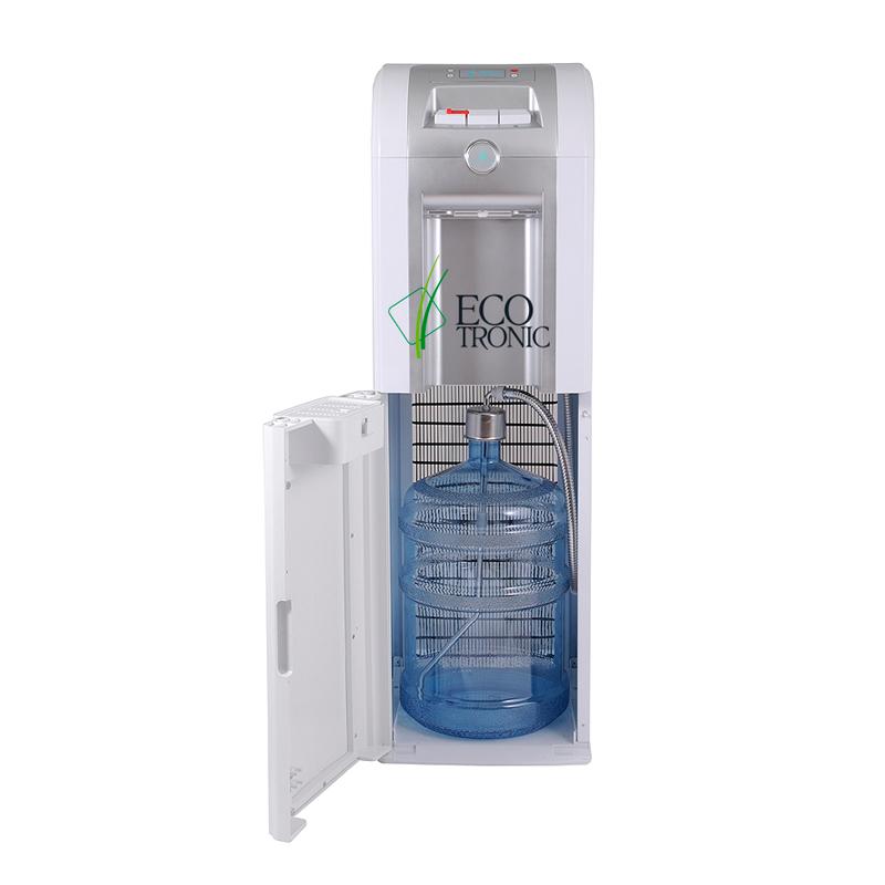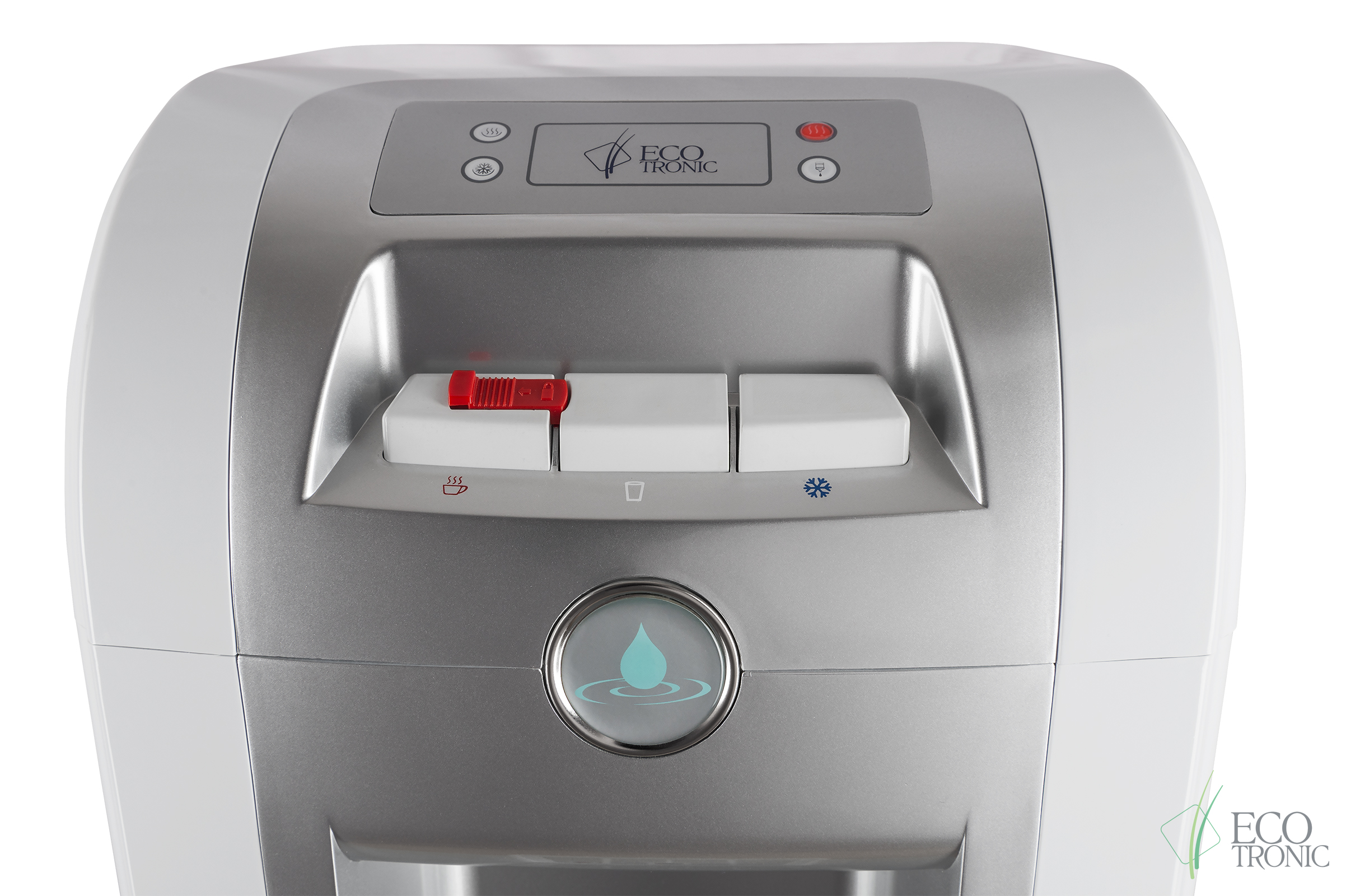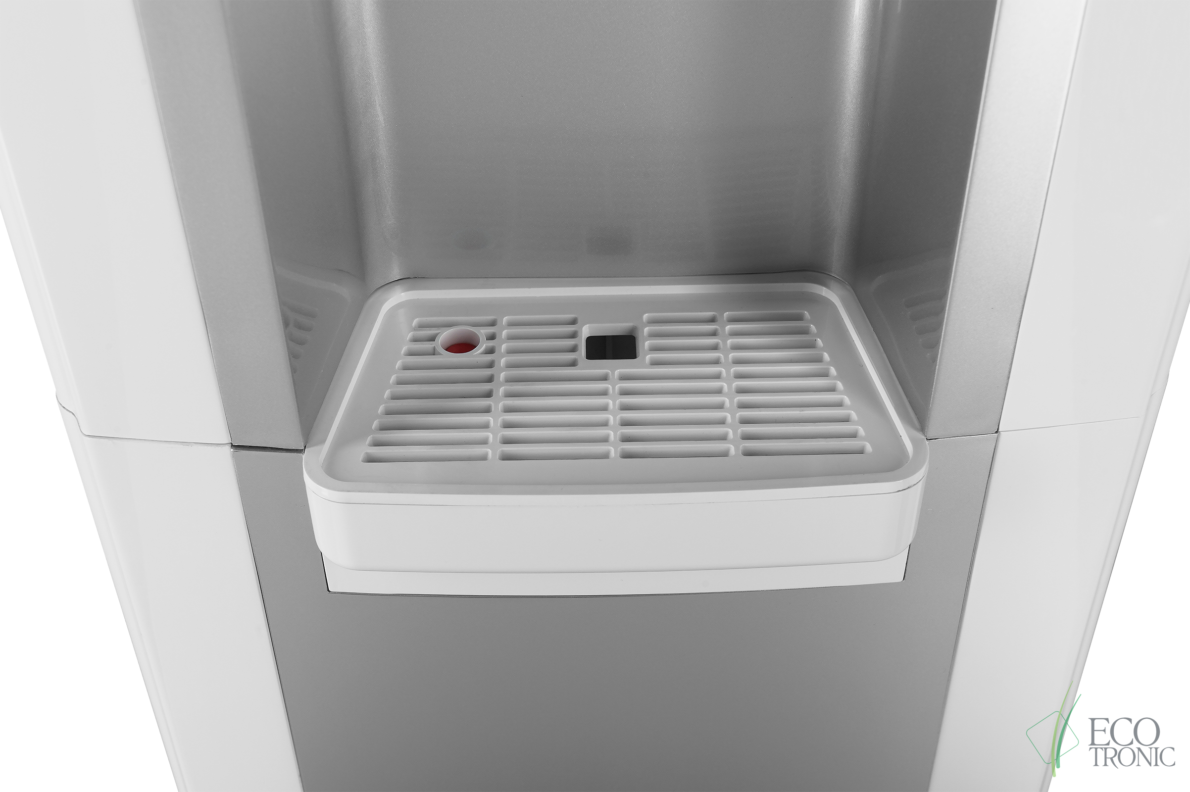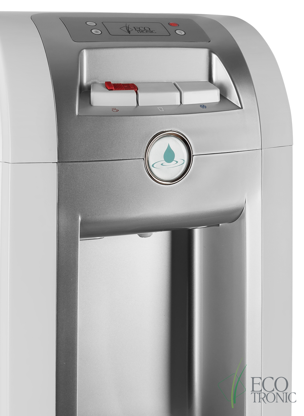 Ecotronic P8-LX White — кулер с нижней загрузкой бутыли. Специальная изогнутая, регулируемая по длине заборная трубка позволяет производить забор воды из бутыли без остатка. Закачка воды в систему кулера происходит с помощью водной помпы. Три крана подачи воды: горячая, прохладная и холодная. Горячий кран с защитой от случайного нажатия (защита от детей). Подсветка отделения для забора воды. Лоток со встроенным поплавком, сигнализирующим о заполнении. Выкатная полка отсутствует.