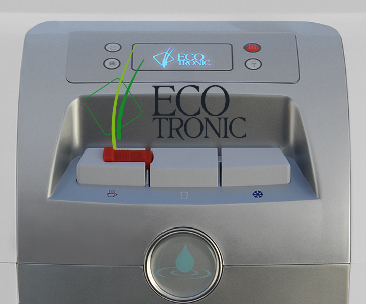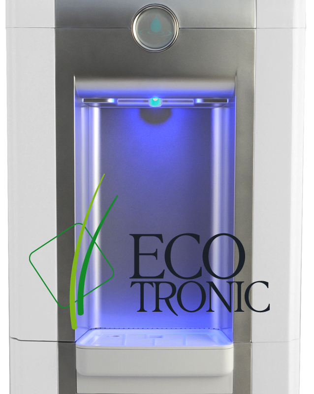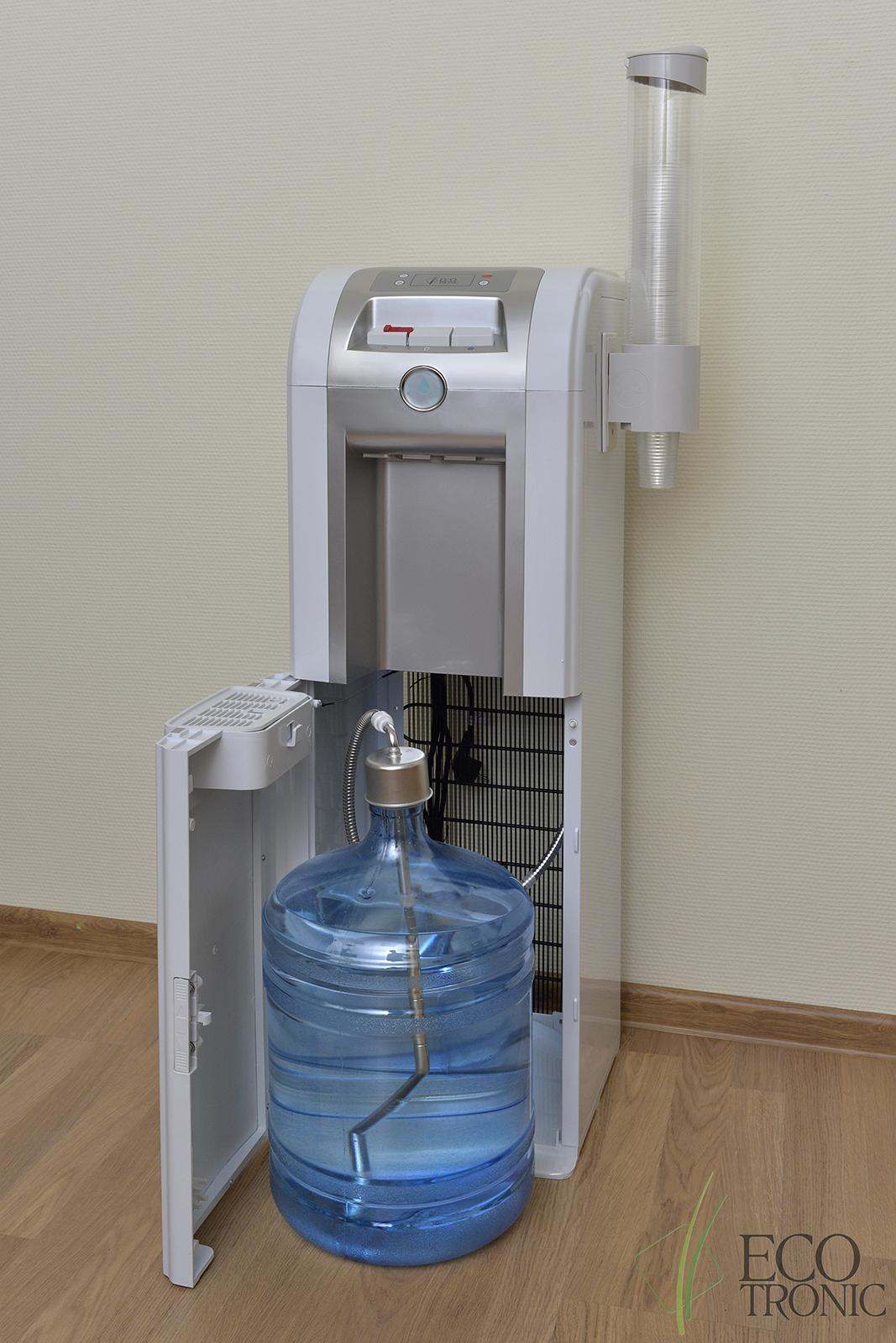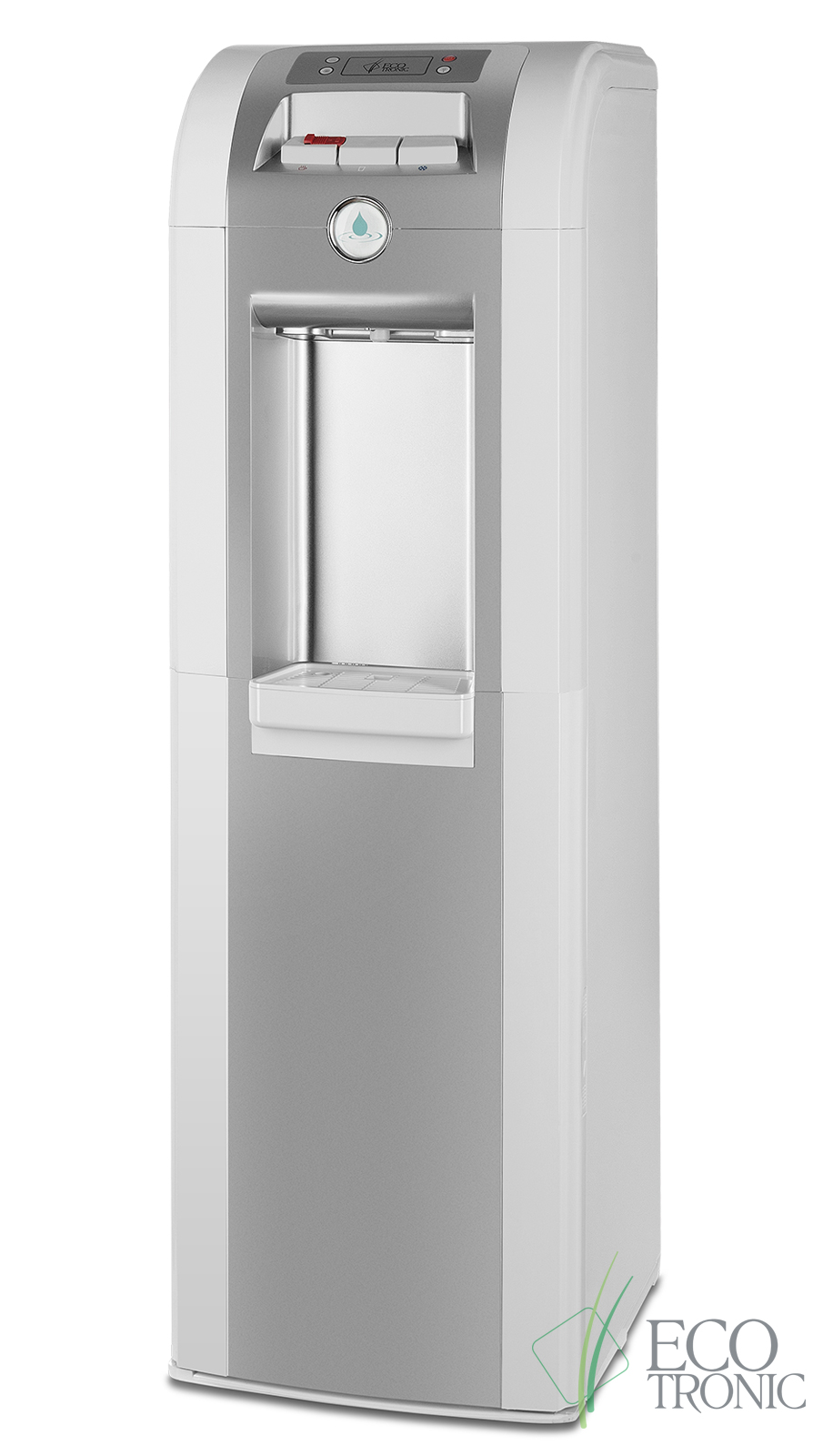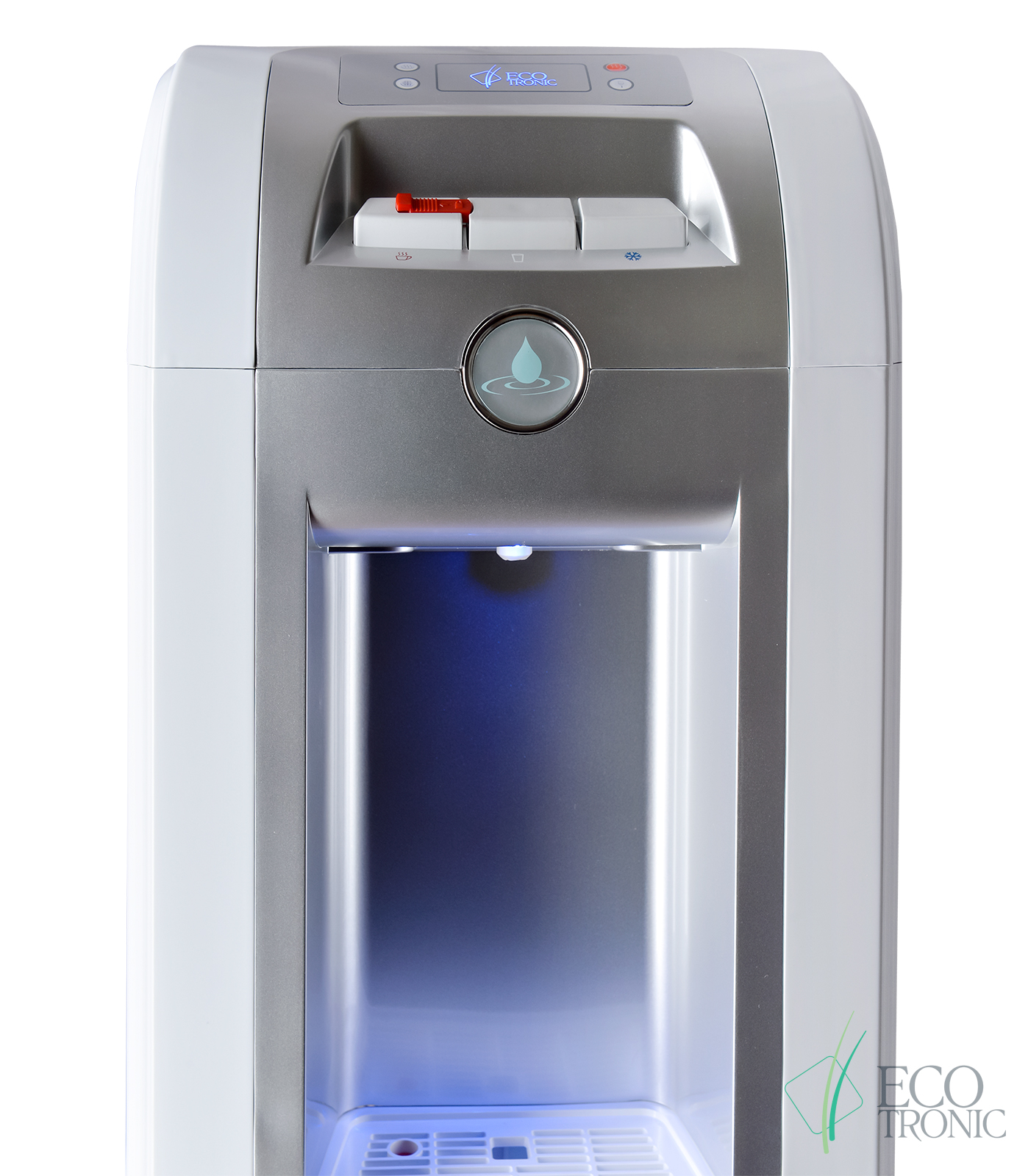 Ecotronic P8-LX White — кулер с нижней загрузкой бутыли. Специальная изогнутая, регулируемая по длине заборная трубка позволяет производить забор воды из бутыли без остатка. Закачка воды в систему кулера происходит с помощью водной помпы. Три крана подачи воды: горячая, прохладная и холодная. Горячий кран с защитой от случайного нажатия (защита от детей). Подсветка отделения для забора воды. Лоток со встроенным поплавком, сигнализирующим о заполнении. Выкатная полка отсутствует.