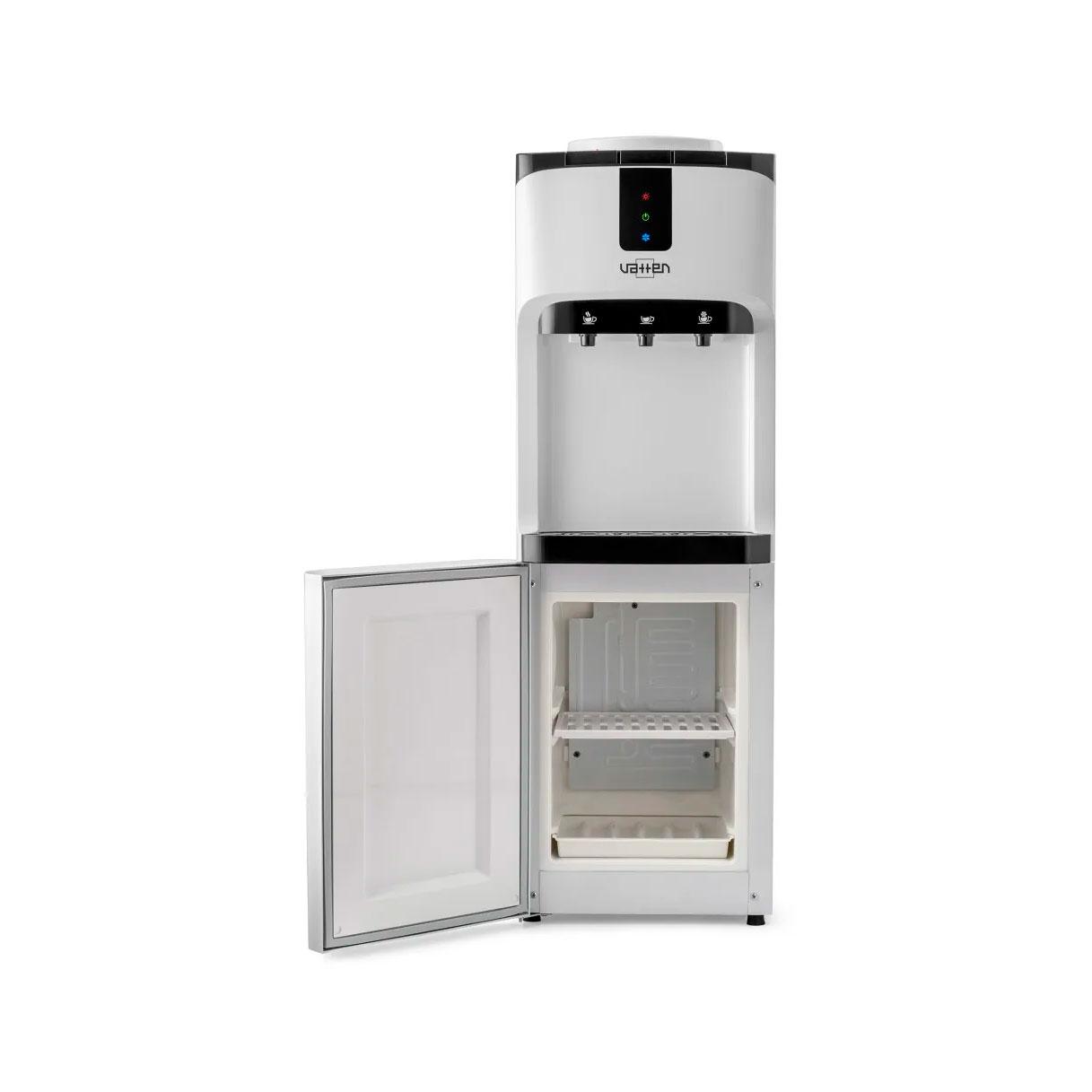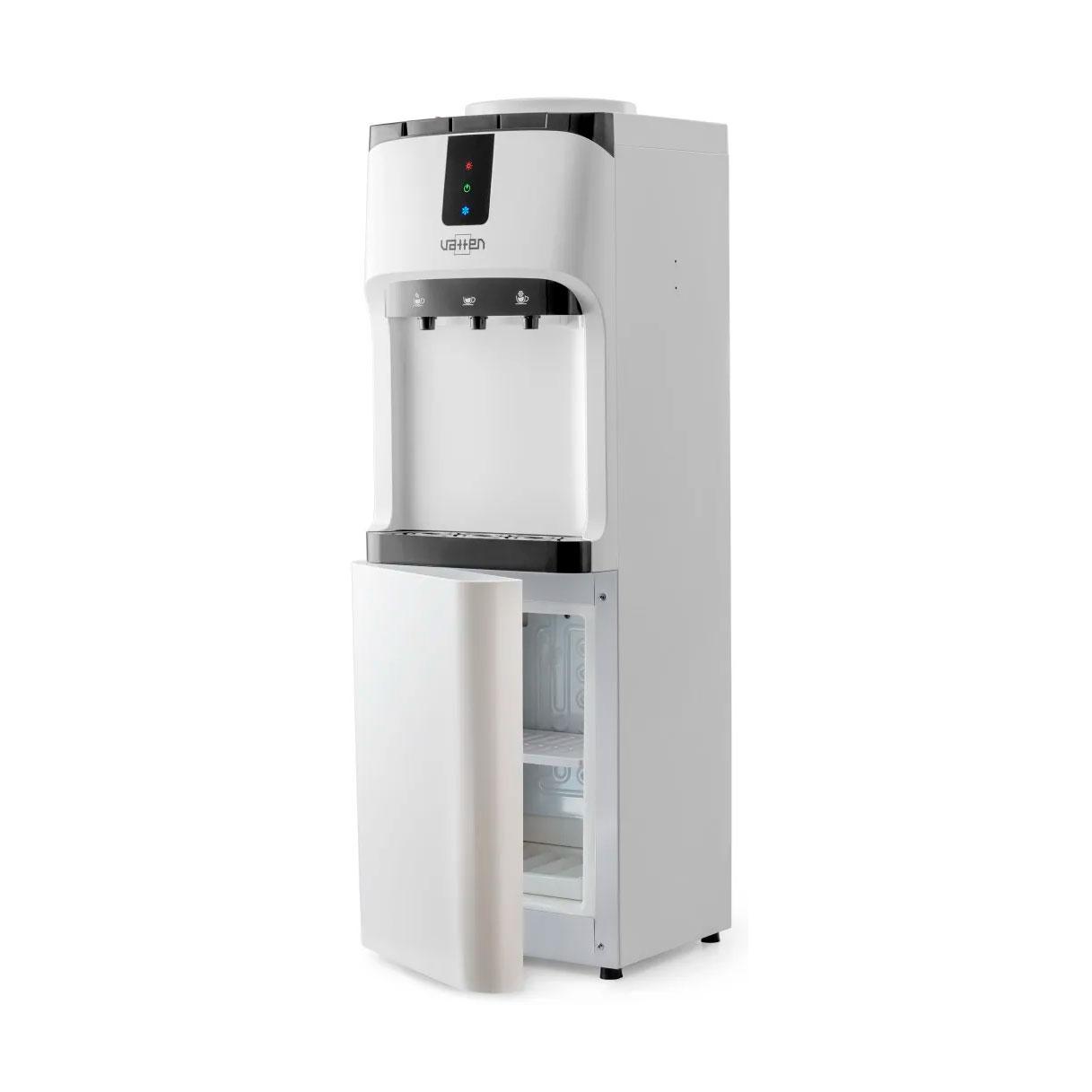 Классический напольный кулер с верхней загрузкой бутыли и минибаром. Компрессорное охлаждение и есть отдельно нагрев. Устройство подает воду горячей, холодной и комнатной температуры. Разлив воды осуществляется нажатием на кнопку крана. Три LED индикатора (включение питания, нагрев и охлаждение). Преимущества для офиса: Наличие компрессора позволяет охлаждать воду до 5 градусов Цельсия, что актуально для обеспечения сотрудников питьевой водой разной температуры в зависимости от сезона. Оснащен холодильной камерой (минибаром) на 12 литров — в ней можно хранить бутерброды и напитки.
