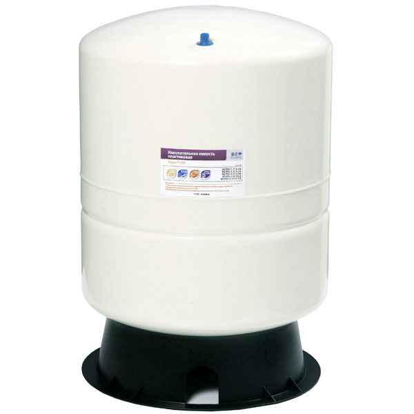 Накопительная емкость — предназначен для хранения воды, очищенной по технологии обратного осмоса. Чтобы чистая вода всегда была под рукой, в систему фильтров включен накопительный бак, компенсирующий малую производительность обратноосмотической мембраны, гаранта высочайшего качества очистки воды. Накопительный бак для систем обратного осмоса Raifil изготовлен из высокопрочного, экологически чистого полипропилена, который допущен для применения в пищевой промышленности. Герметичность накопительной емкости позволяет сохранить вкусовые качества воды и предотвращает от попадания внутрь пыли и посторонних запахов. Бак имеет две камеры изолированные друг от друга, разделенной диафрагмой (грушей) из пищевой резины. Нижняя емкость предназначена для воздуха, а верхняя – непосредственно для чистой воды. В нижнюю камеру, (подобна резиновой груше) пространство между стенкой емкости и диафрагмы закачан воздух. Избыточное давление, которое должно быть создано в пустом баке — около 0,7 атм. Подача чистой воды после обратноосмотической мембраны осуществляется в середину резиновой груши. Этот процесс продолжается до тех пор, пока давление сжимающегося воздуха между баком и диафрагмой не уравновесит давление воды на входе в бак. Благодаря давлению воздуха мембрана раздувается, что дает возможность полностью опорожнять от воды бак. Со стороны воздушной камеры установлен ниппель, позволяющий в случае необходимости закачать либо спустить давления воздуха в накопительном баке. Сверху на баке установлена резьба, на которую накручивается кран накопительного бака для подачи и забора воды. Корпус бака изготавливается из металла. Для корректного выбора накопительного бака рекомендуем учесть тот факт, что от номинального объема бака, указанного в названии, полезного объема составляет от 50 до 75%. Т.е. в бак объемом 10 л поместится лишь 5 — 7,5 л очищенной воды.