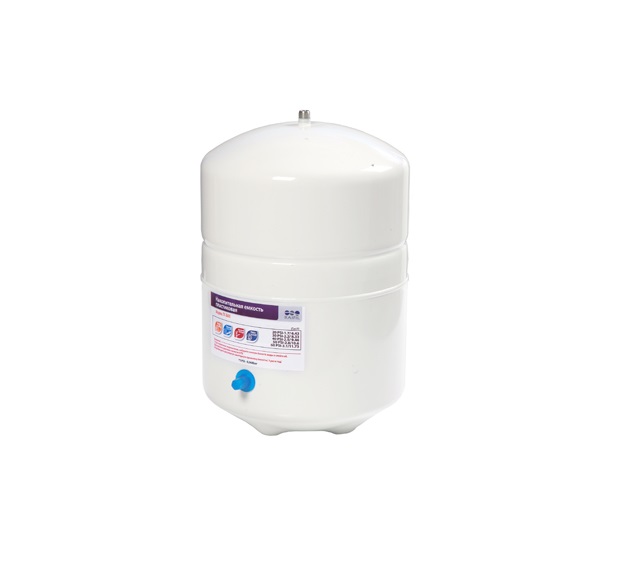 Накопительная емкость — предназначен для хранения воды, очищенной по технологии обратного осмоса. Чтобы чистая вода всегда была под рукой, в систему фильтров включен накопительный бак, компенсирующий малую производительность обратноосмотической мембраны, гаранта высочайшего качества очистки воды. Накопительный бак для систем обратного осмоса Raifil изготовлен из высокопрочного, экологически чистого полипропилена, который допущен для применения в пищевой промышленности. Герметичность накопительной емкости позволяет сохранить вкусовые качества воды и предотвращает от попадания внутрь пыли и посторонних запахов. Бак имеет две камеры изолированные друг от друга, разделенной диафрагмой (грушей) из пищевой резины. Нижняя емкость предназначена для воздуха, а верхняя – непосредственно для чистой воды. В нижнюю камеру, (подобна резиновой груше) пространство между стенкой емкости и диафрагмы закачан воздух. Избыточное давление, которое должно быть создано в пустом баке — около 0,7 атм. Подача чистой воды после обратноосмотической мембраны осуществляется в середину резиновой груши. Этот процесс продолжается до тех пор, пока давление сжимающегося воздуха между баком и диафрагмой не уравновесит давление воды на входе в бак. Благодаря давлению воздуха мембрана раздувается, что дает возможность полностью опорожнять от воды бак. Со стороны воздушной камеры установлен ниппель, позволяющий в случае необходимости закачать либо спустить давления воздуха в накопительном баке. Сверху на баке установлена резьба, на которую накручивается кран накопительного бака для подачи и забора воды. Корпус бака изготавливается из металла. Для корректного выбора накопительного бака рекомендуем учесть тот факт, что от номинального объема бака, указанного в названии, полезного объема составляет от 50 до 75%. Т.е. в бак объемом 10 л поместится лишь 5 — 7,5 л очищенной воды.