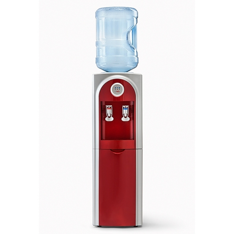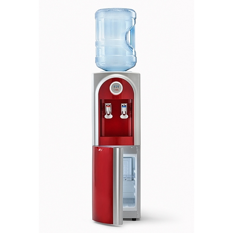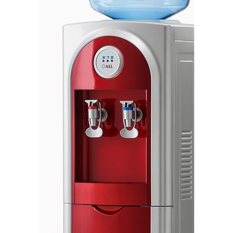 Кулер для воды со шкафчиком напольный LC-AEL-123C RED. Компрессорное охлаждение (6-8 градусов) и шкафчиком для хранения объемом 16 л. (≅240х180х320 мм). Шкафчик не охлаждается, обычно там хранят: чай, кофе, сахар. Цвет – серебро с красной вставкой. Краны — «Нажим кружкой». Сзади есть два тумблера, которые отключают холодную и горячую воду.