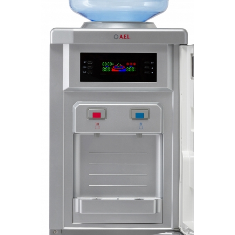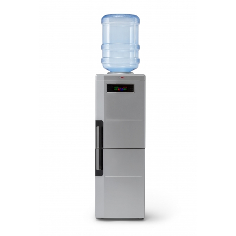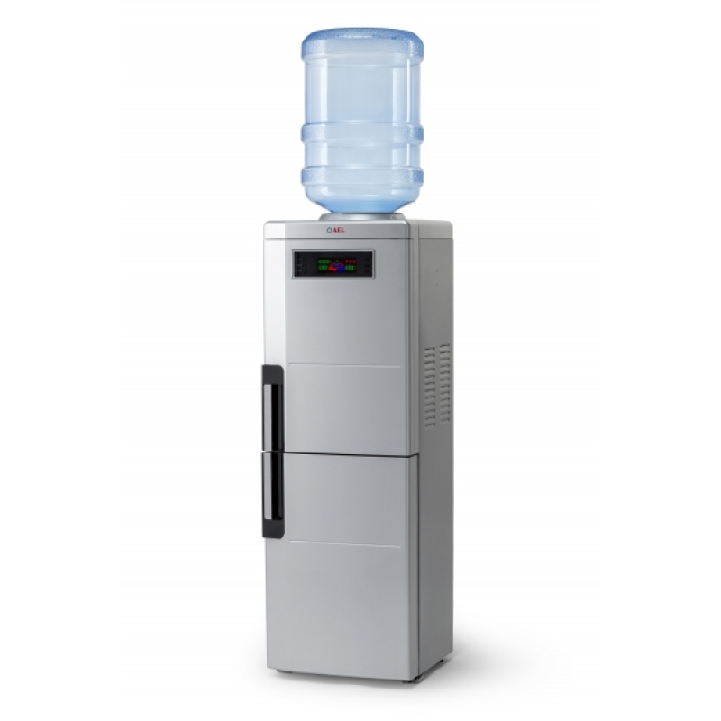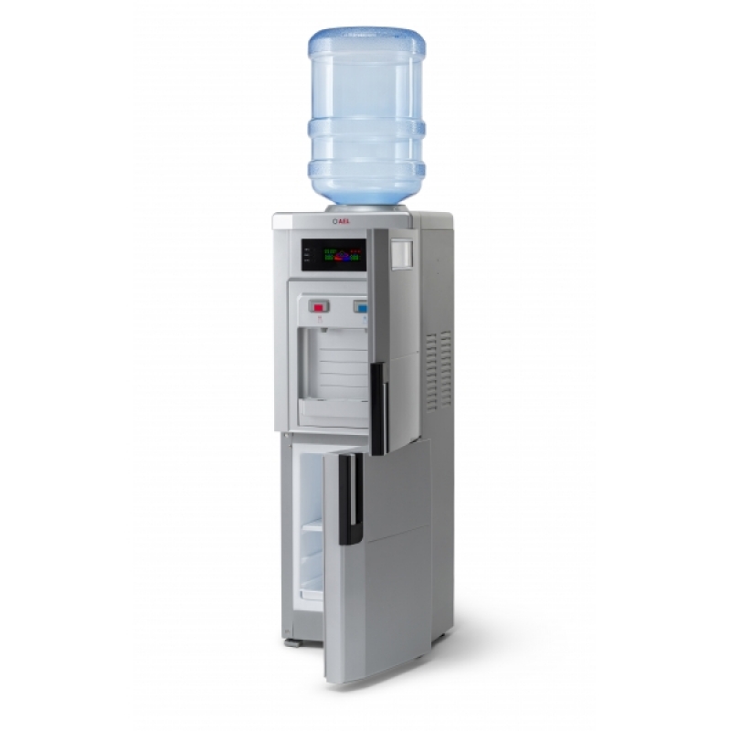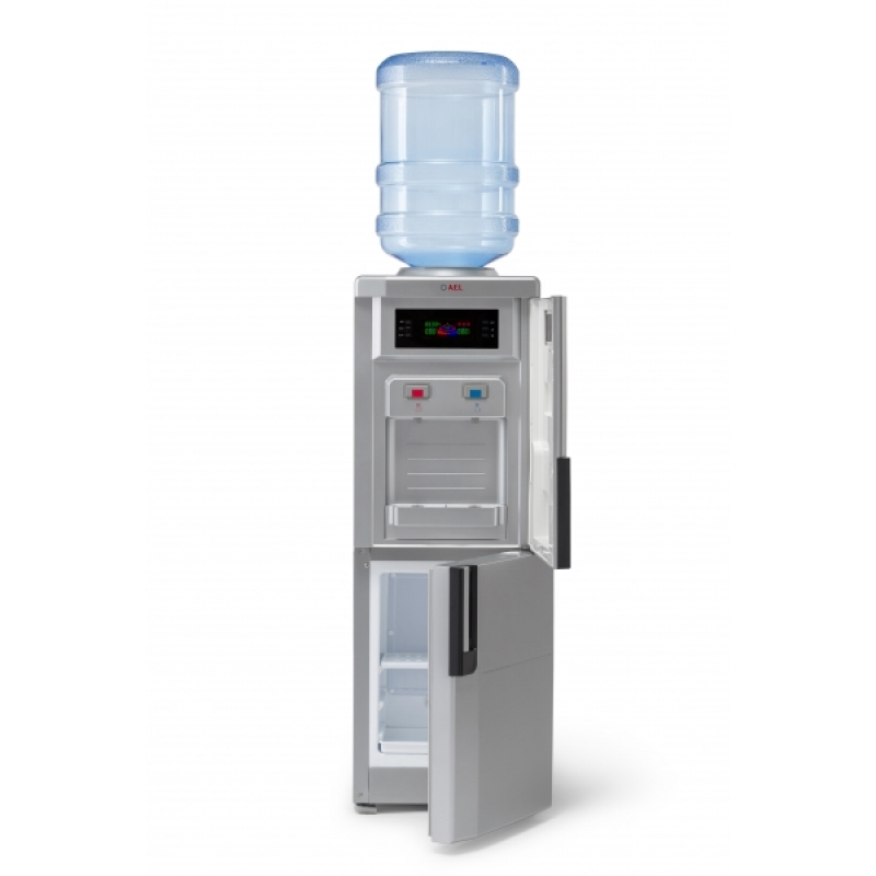 Кулер для воды с холодильником напольный LC-AEL-188BD. Компрессорное охлаждение (6-8 градусов). Электронная панель с часами, показывающая температуру и состояние нагрева и охлаждения. Цвет – серебро. Краны-клавиши закрыты дверцей. Шкаф-холодильник, объемом на 12 литров (≅140х240х340 мм).