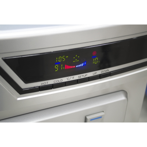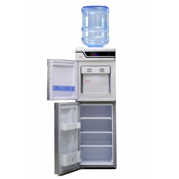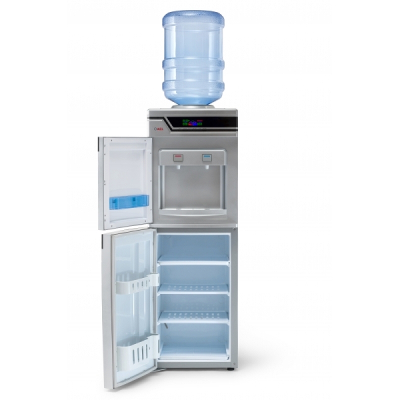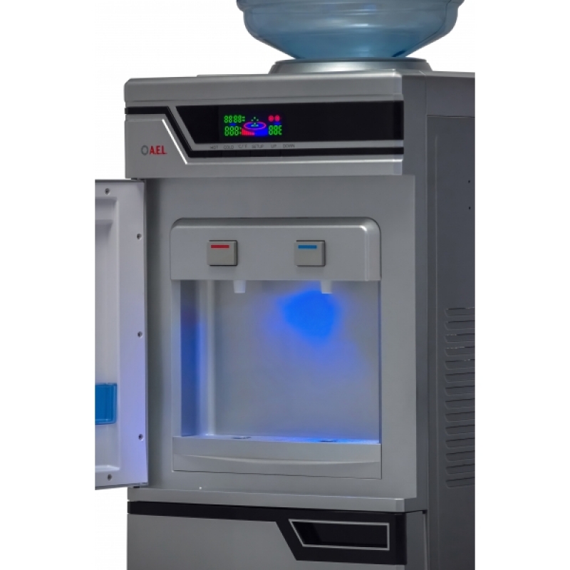 Кулер для воды с холодильником напольный LC-AEL-301BD. Компрессорное охлаждение (6-8 градусов). Электронная панель с часами, показывающая температуру и состояние нагрева и охлаждения. Цвет – серебро. Краны-клавиши закрыты дверцей. Шкаф-холодильник, объемом на 50 литров (≅300х310х530 мм), с легкостью может удовлетворить потребности владельца аппарата в офисе или дома в холодной воде или хранении продуктов.