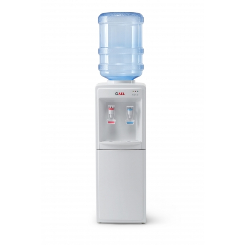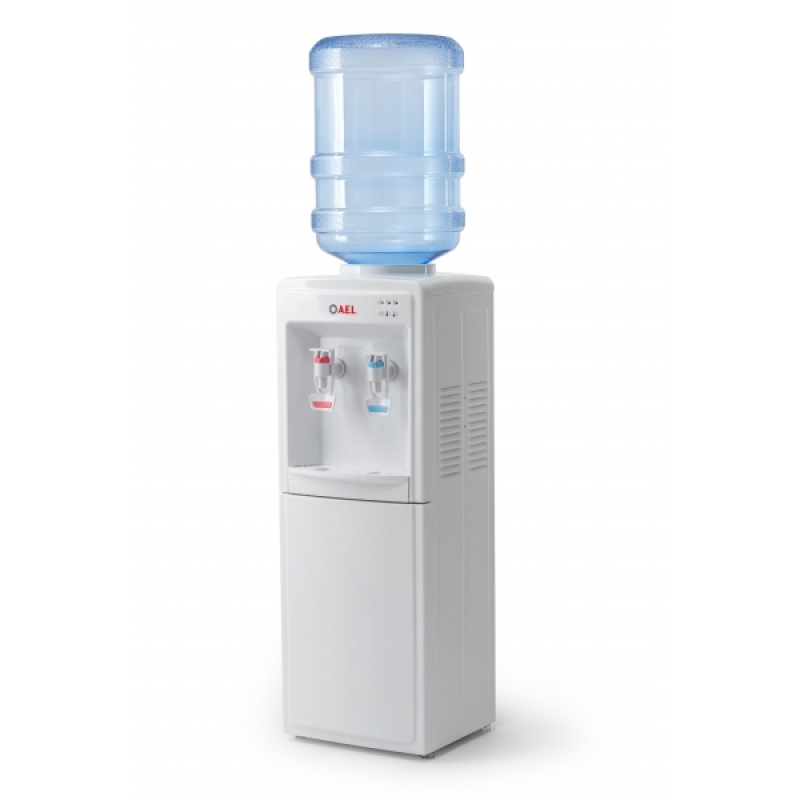 Кулер для воды напольный LC-AEL-352. Компрессорное охлаждение (6-8 градусов). Цвет — белый. Краны — нажим кружкой. Высота аппарата несколько ниже обычного кулера — всего 85 см, обратите на это внимание! Сзади есть два тумблера, которые отключают холодную и горячую воду.