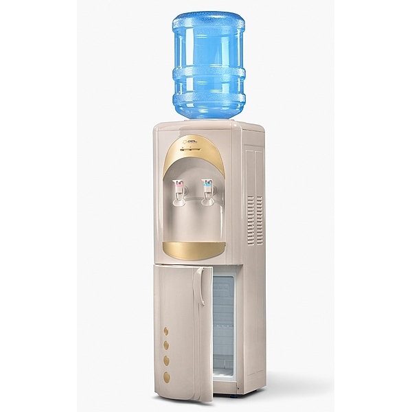 Кулер для воды со шкафчиком напольный YLR 2-5-X 16 L-B/HL. Компрессорное охлаждение (6-8 градусов) и шкафчиком для хранения объемом 16 л. (≅240х210х320 мм). Шкафчик не охлаждается, обычно там хранят: чай, кофе, сахар. Цвет – бежевый с золотой вставкой. Краны — «Нажим кружкой». Сзади есть два тумблера, которые отключают холодную и горячую воду.