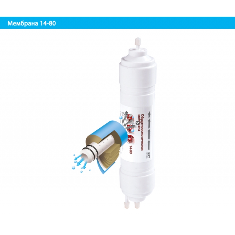 Мембрана изготовлена на основе полупроницаемого тонкопленочного композита с диаметром отверстий 1А(10 мкр). Удаляет все органические загрязнения (тригалометаны и соли тяжелых металлов, железо, ртуть, мышьяк, марганец и т.д.), а также бактерии и вирусы