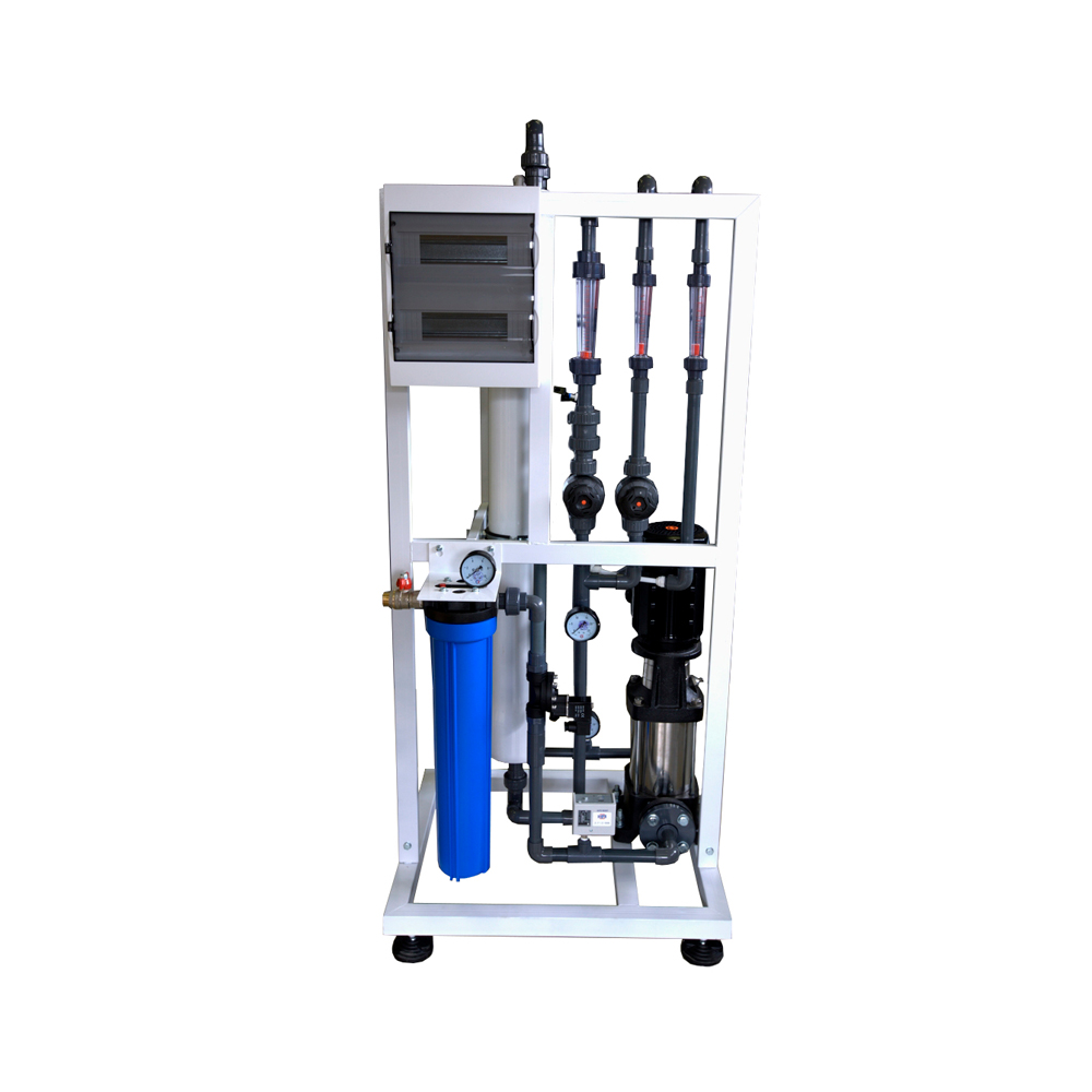 Установка системы промышленного обратного осмоса представлена модулем на прочной металлической раме. Установка состоит из фильтра механической очистки, насоса высокого давления, мембранного блока с обратноосмотическими мембранными элементами. Установка работает в автоматическом режиме, снабжена необходимыми контрольно-измерительными приборами и запорно-регулирующей арматурой. Комплектация установок может меняться в рамках технических условий ТУ без ухудшения их технических характеристик.