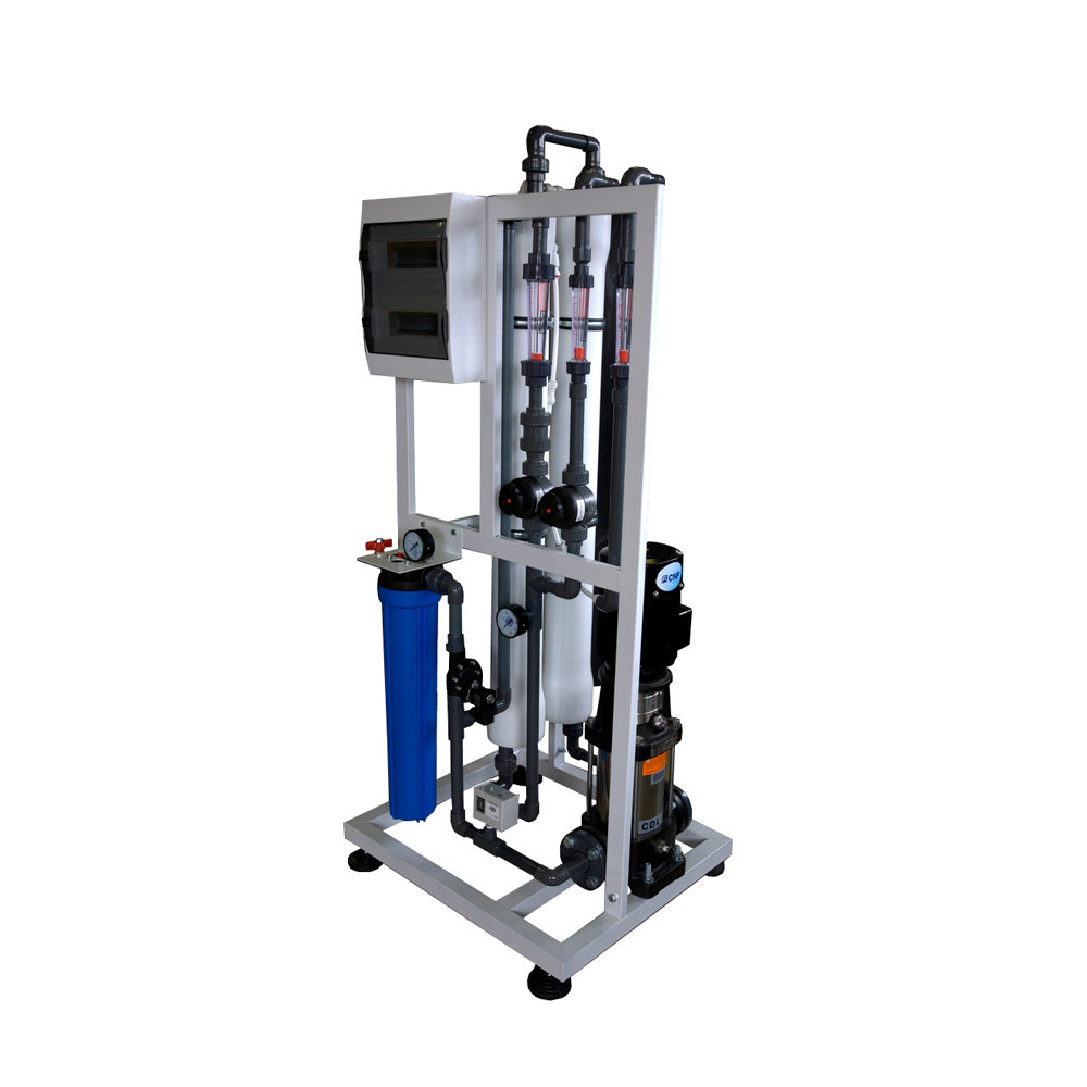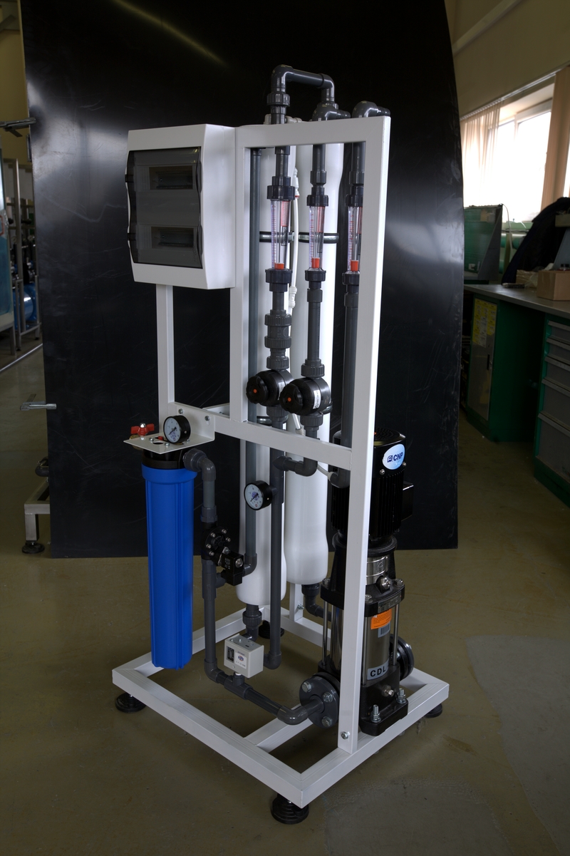 Установка системы промышленного обратного осмоса представлена модулем на прочной металлической раме. Установка состоит из фильтра механической очистки, насоса высокого давления, мембранного блока с обратноосмотическими мембранными элементами. Установка работает в автоматическом режиме, снабжена необходимыми контрольно-измерительными приборами и запорно-регулирующей арматурой. Комплектация установок может меняться в рамках технических условий ТУ без ухудшения их технических характеристик.