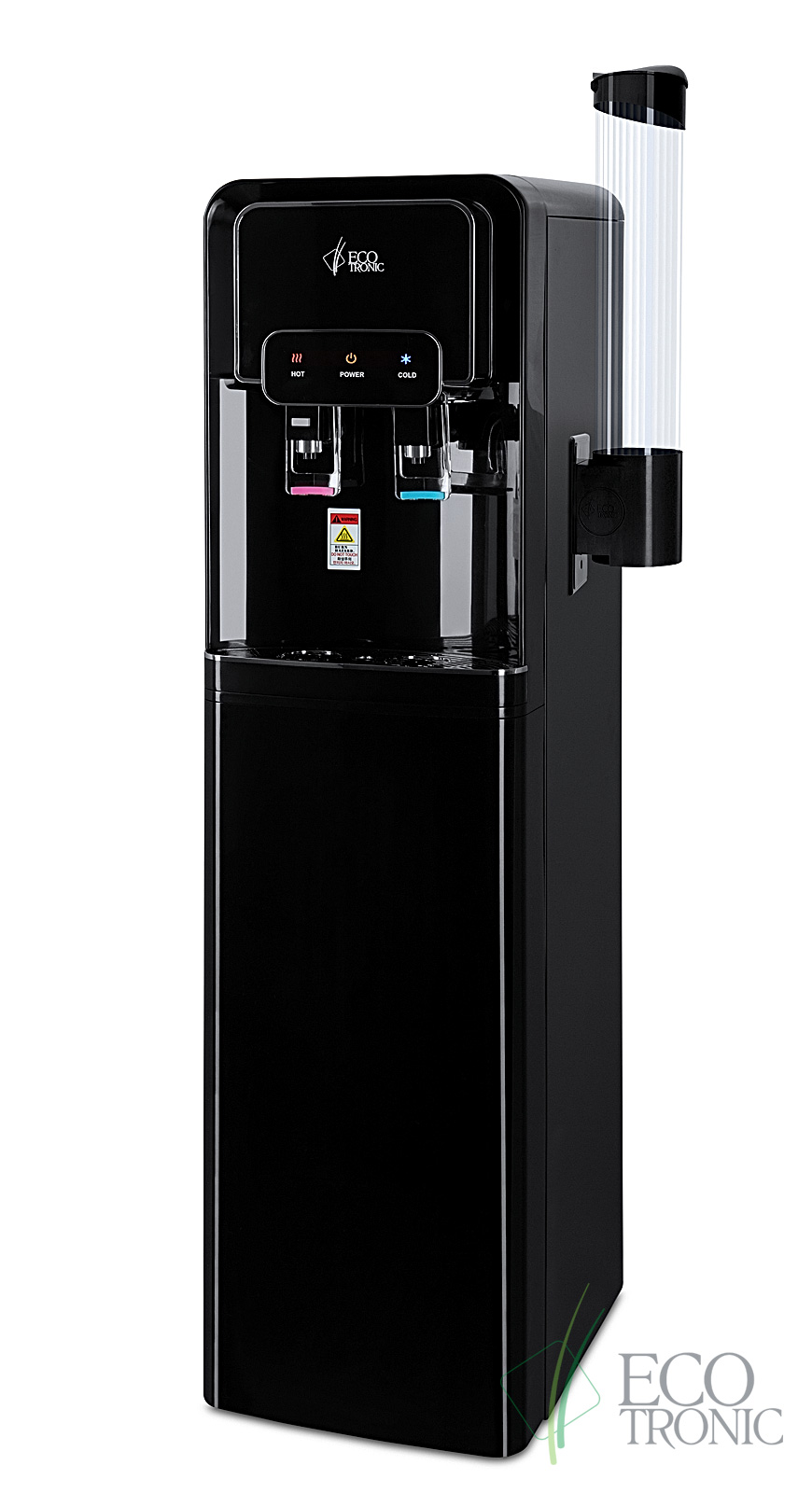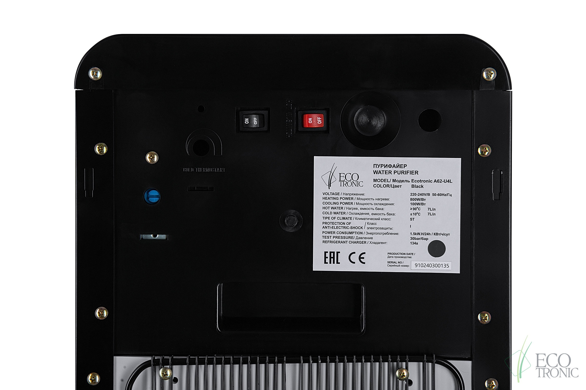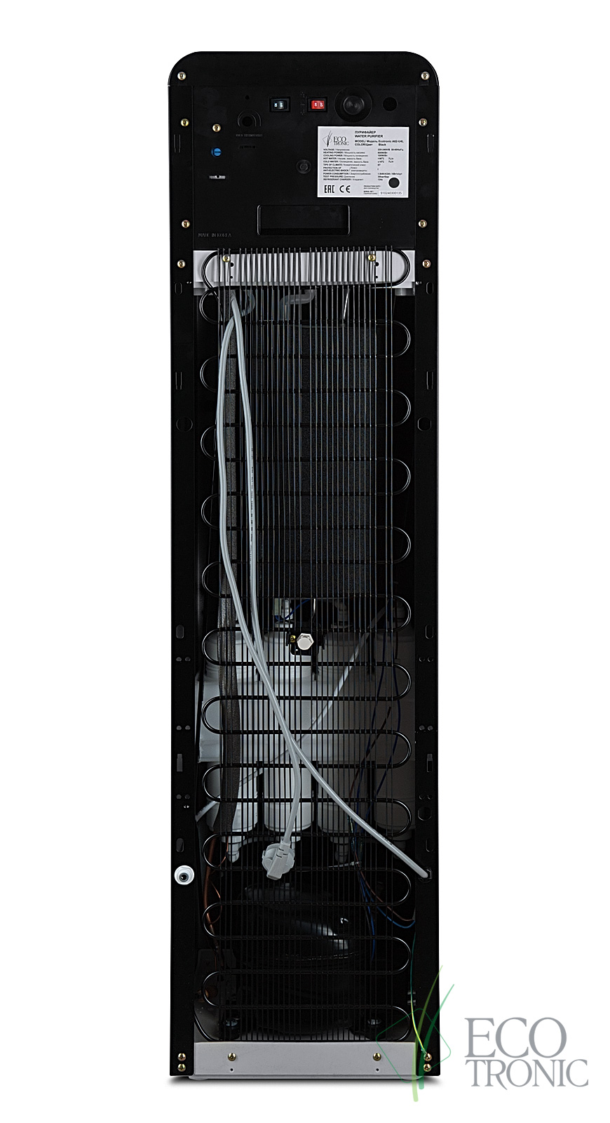 Пурифайер напольного типа с ультрафильтрационной системой очистки воды. Бак холодной воды цельнотянутый, емкостью 7 л. Бак горячей воды также 7 л. Мощность нагревательного элемента 770 Вт. Защита на кране горячей воды. Краны «нажим кружкой». Выглючатели нагрева и охлаждения сзади на корпусе.