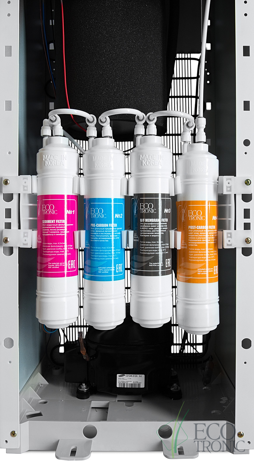 Пурифайер напольного типа с ультрафильтрационной системой очистки воды. Один из самых больших баков холодной (~10л.) и горячей воды (~7л.) Мощность нагревательного элемента 800Вт. Защита на кране горячей воды с возможностью отключения. Краны «нажим кружкой». Цвет: белый с черной вставкой. Производство: Корея.