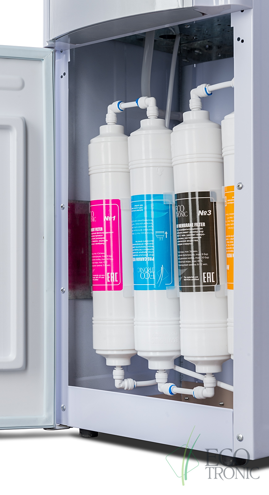 Пурифайер Ecotronic H1-U4LE white-silver с ультрафильтрацией. Электронное охлаждение. 4-х ступенчатая система очистки. Краны подачи воды «нажим кружкой». бак гв 1.2л., бак хв 4л. Внешний тэн нагрева.