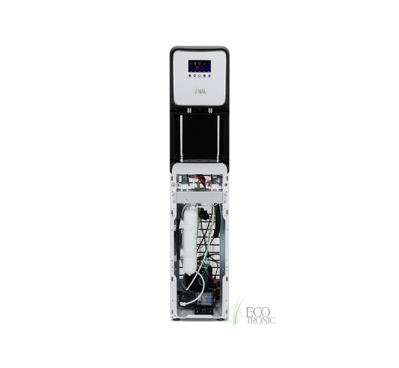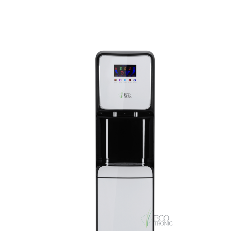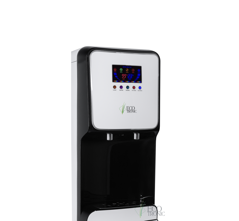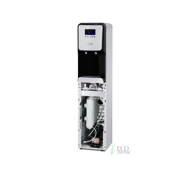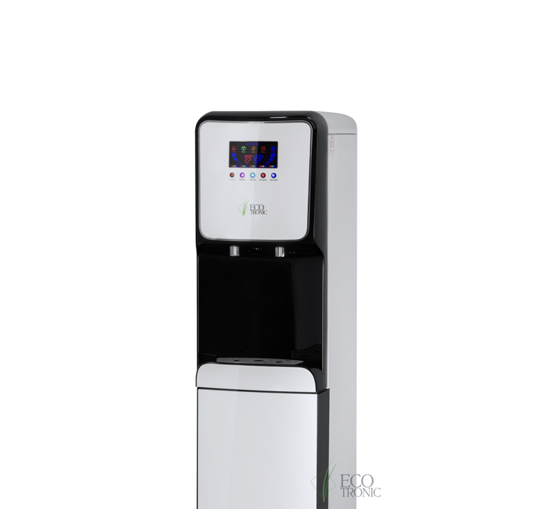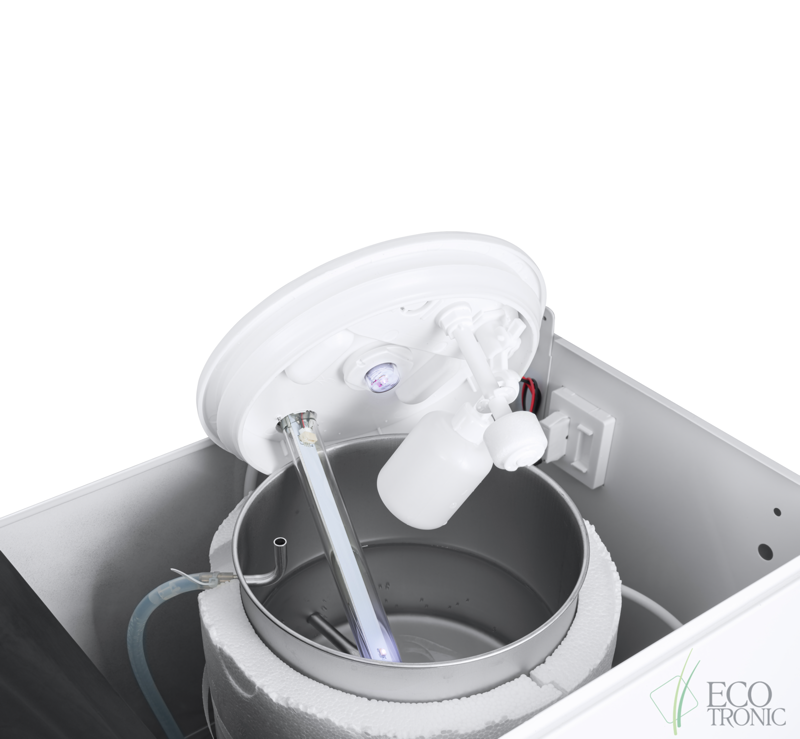 Пурифайер напольного типа Ecotronic L8-R4LM UV подготавливает максимально очищенную воду как по химическим, так и по микробиологическим показателям. Это происходит за счёт системы очистки воды на основе мембраны обратного осмоса и функции UV-стерилизации. Фильтрованная вода накапливается в баке холодной воды, в котором сверху и снизу расположены две ультрафиолетовые лампы малой мощности, что позволяет эффективно предотвращать развитие бактерий при долгом воздействии, а сами UV-лампы служат в несколько раз дольше обычных.
