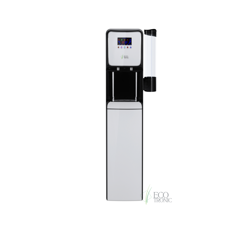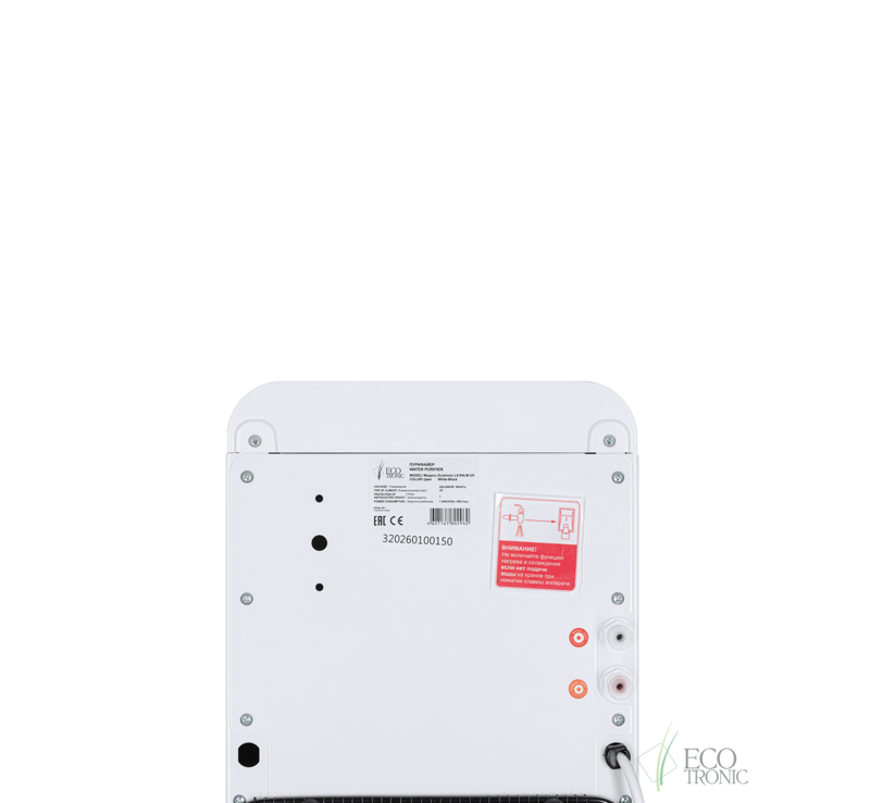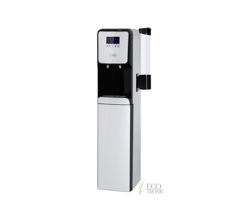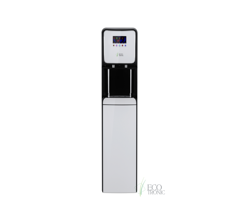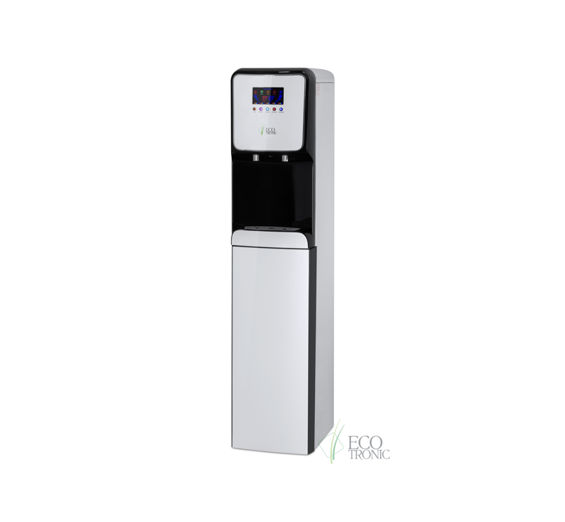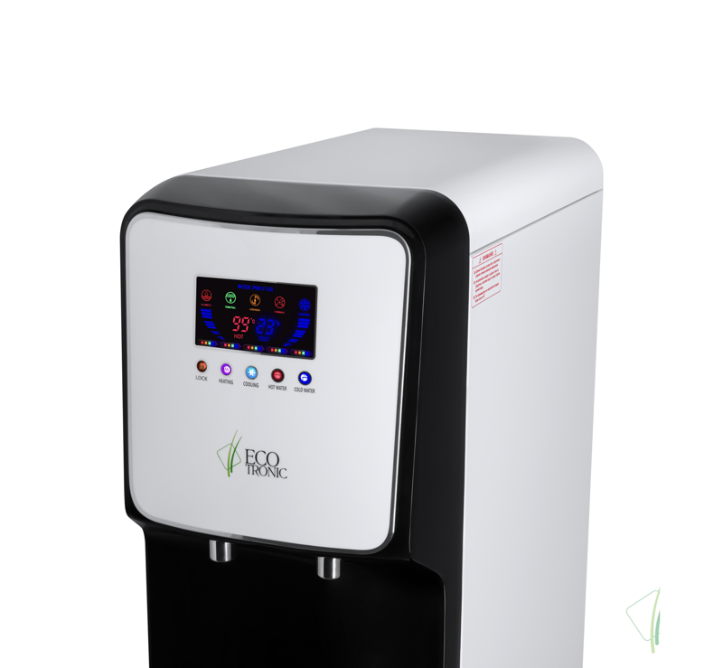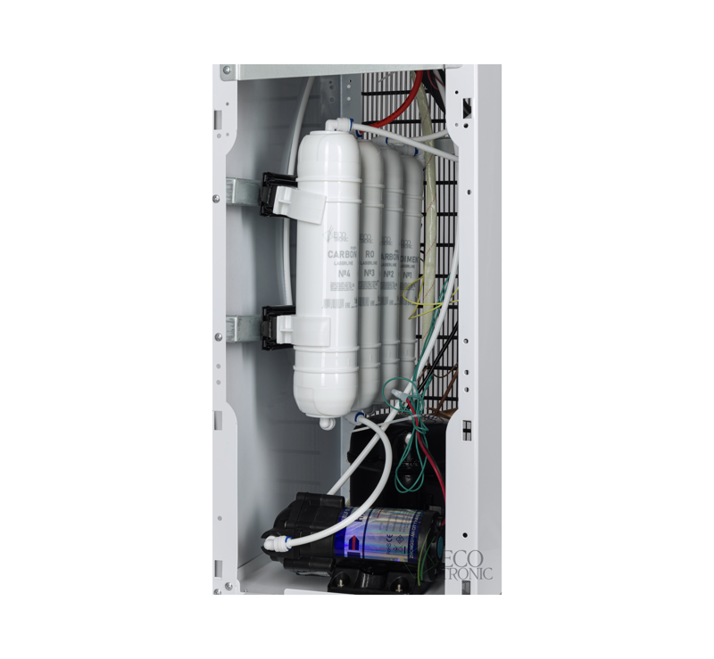 Пурифайер напольного типа Ecotronic L8-R4LM UV подготавливает максимально очищенную воду как по химическим, так и по микробиологическим показателям. Это происходит за счёт системы очистки воды на основе мембраны обратного осмоса и функции UV-стерилизации. Фильтрованная вода накапливается в баке холодной воды, в котором сверху и снизу расположены две ультрафиолетовые лампы малой мощности, что позволяет эффективно предотвращать развитие бактерий при долгом воздействии, а сами UV-лампы служат в несколько раз дольше обычных.