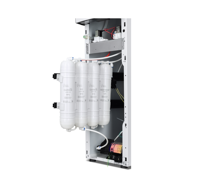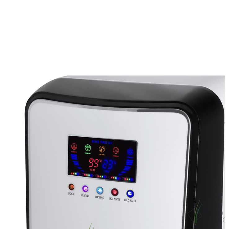 Цветной светодиодный дисплей с управлением и индикацией нагрева и охлаждения воды, а также наглядная индикация срока службы фильтров для их замены. Два крана, подача воды по нажатию на сенсорные кнопки. Защита на кране горячей воды. Система контроля давления воды в аппарате. Фильтрационная система на салазках для удобной замены фильтров и прочего обслуживания аппарата. Компрессорное охлаждение. Основной цвет белый, с черными вставками.