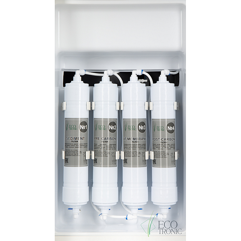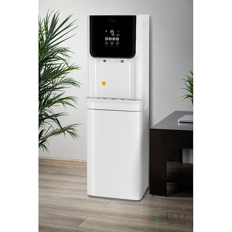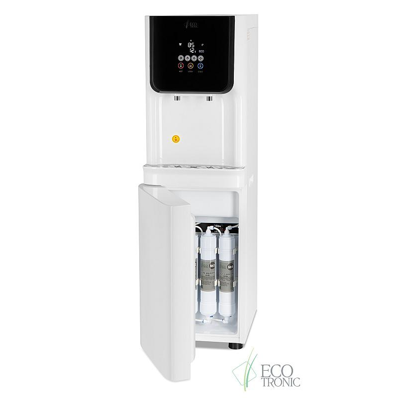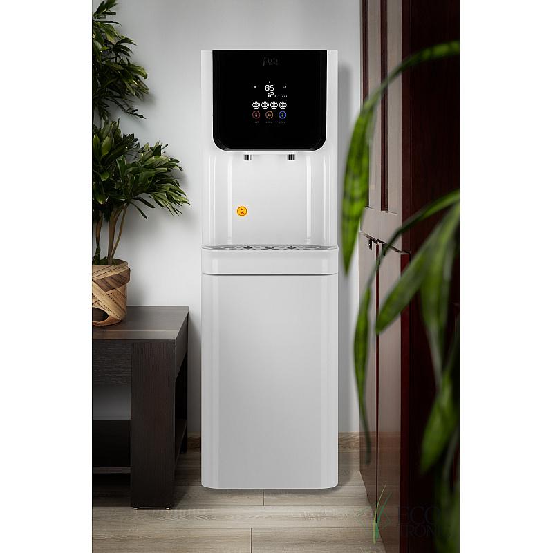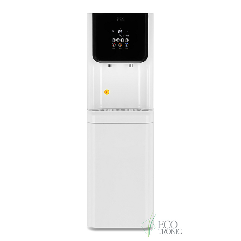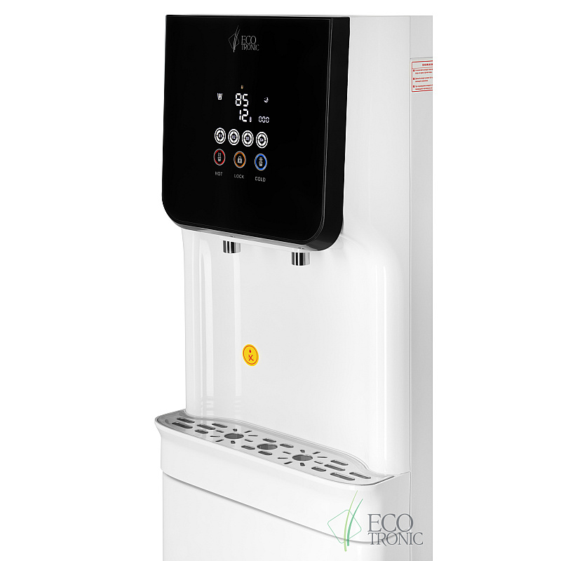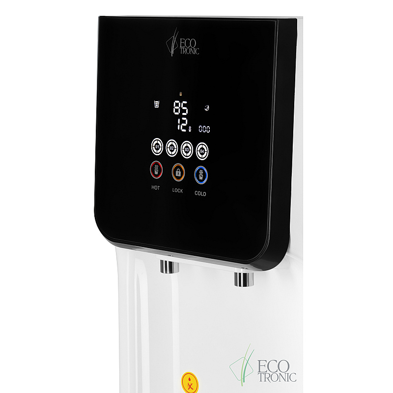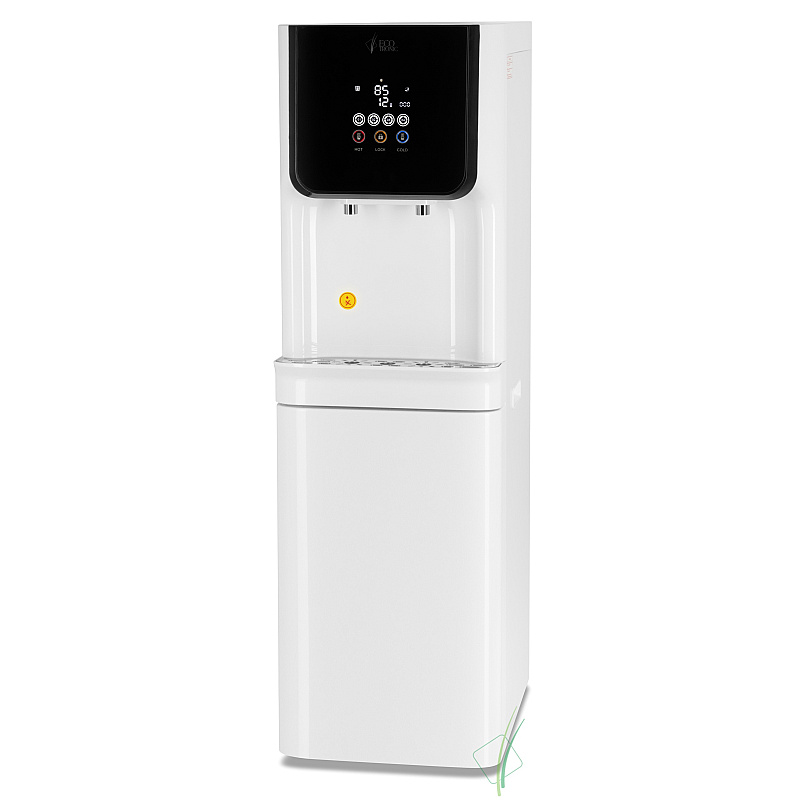 Пурифайер с исключительно большой производительностью — вместительный бак горячей воды (9л) и накопительный бак с отсеком для холодной воды 23л (18л накопительная часть и 5л отсек для холодной воды). Сенсорная панель управления с LED-дисплеем, на котором выводится температура горячей и холодной воды, индикация работы аппарата и срока службы фильтров. На панели управления также расположены сенсорные кнопки подачи горячей и холодной воды и кнопка блокировки случайной подачи горячей воды (защита детей). Подача воды порционно (защита от перелива). При однократном нажатии максимально выдается только ~1л. горячей или ~1,2л. холодной воды. В любой момент подачу воды можно остановить повторным нажатием.