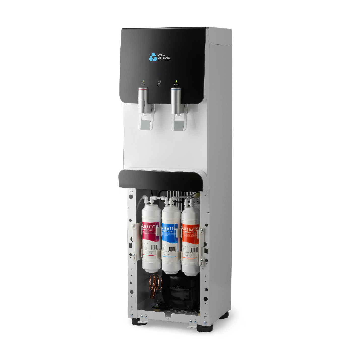 Небычный дизайн аппарата подойдет для офисного помещения, подача воды управляется краниками. Имеется система непорционного получения воды.Панель индикации работы систем охлаждения, нагревания. Наличие режима экономии энергии. Наличие функции «защита от ожогов» (на кранике горячей воды имеется кнопка, блокирующая подачу горячей воды). Цвет черный с белой вставкой. Фильтры UF-U тип, размер 10″.