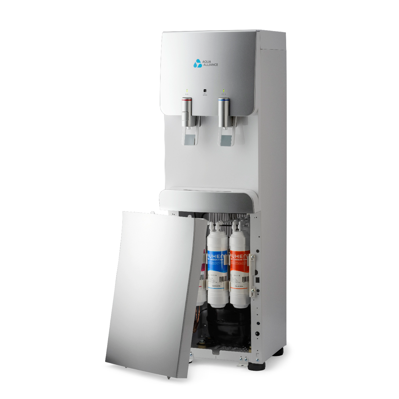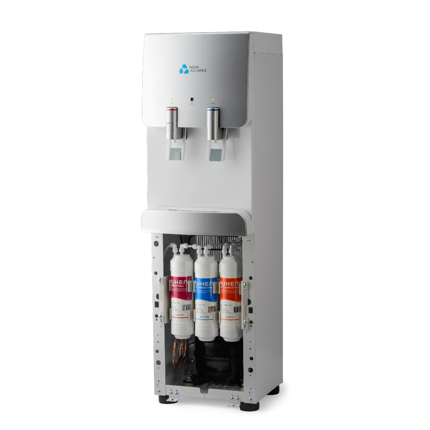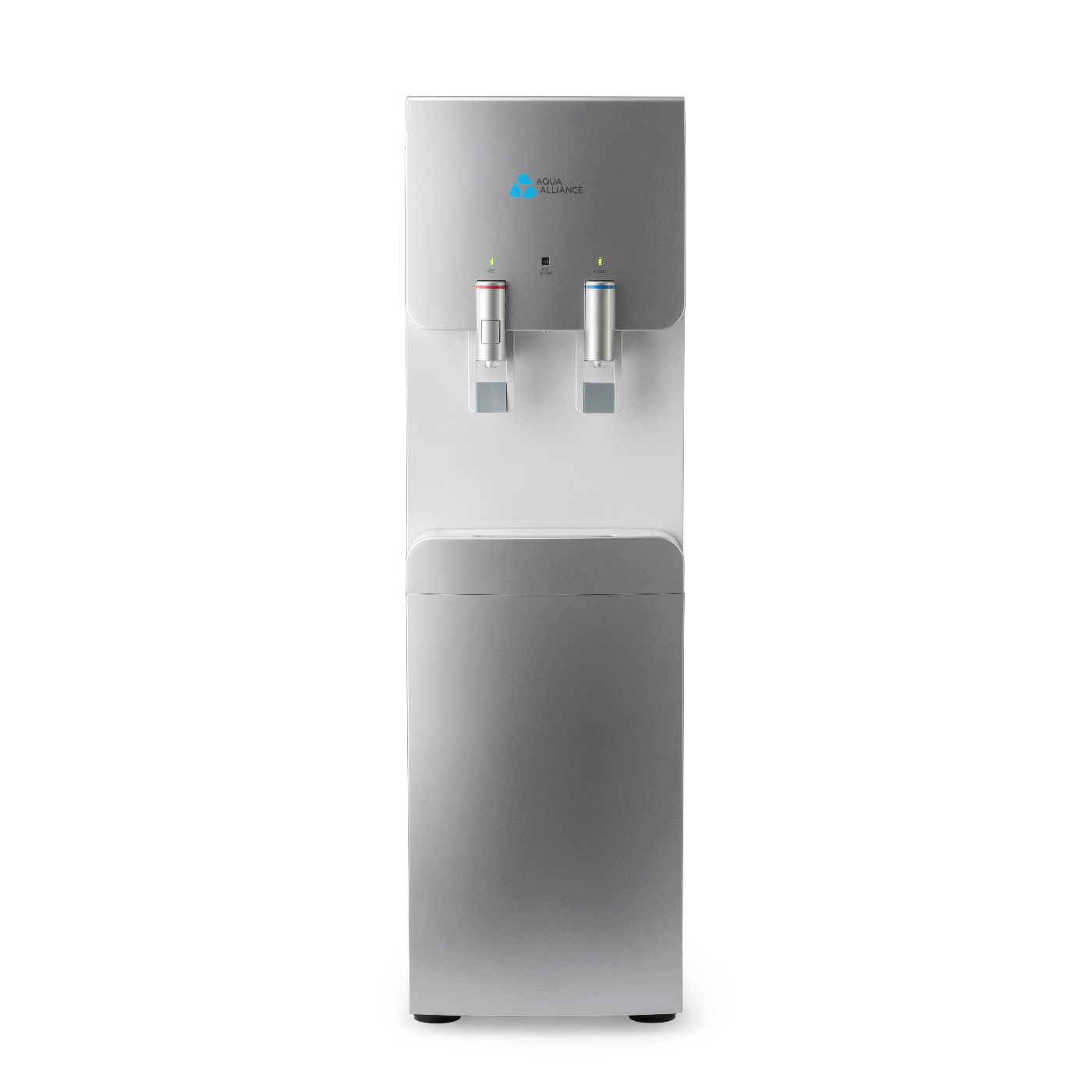 Стильный и необычный дизайн аппарата, подача воды управляется краниками. Имеется система непорционного получения воды.Панель индикации работы систем охлаждения, нагревания. Наличие режима экономии энергии Наличие функции «защита от ожогов» (на кранике горячей воды имеется кнопка, блокирующая подачу горячей воды). Цвет серебро с белой вставкой.Фильтры UF-U тип, размер 10″