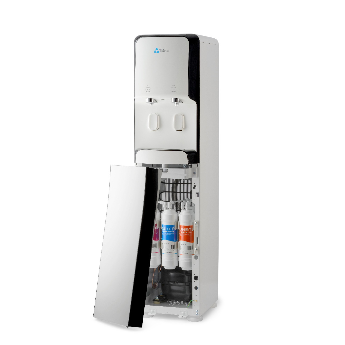 Электромагнитные клавиши «нажим кружкой» с функцией защиты от детей, легко-съемные носики кранов для удобства их санитарной обработки, функция постоянного потока воды для набора большого количества воды, функция энергосбережения, функция UV обеззараживания. Установленная внутри бака система UV обеззараживания дезинфицирует фильтрованную воду. Использование UV LED подавляет возможность репродукции вирусов и бактерий благодаря уничтожению в ультрафиолетовом излучении. Система запускается изначально при подключении сетевого шнура в розетку. Для работы UV-светодиода нет кнопки включения / выключения, он работает автоматически. Во время работы лампа UV LED включается и выключается. Система UV обеззараживания запрограммирована на работу в автоматическом режиме 2 часа / один раз в день. Мощность UV системы 2,0 mW, напряжение 12 V. Фильтры UF-U тип, размер 10″
